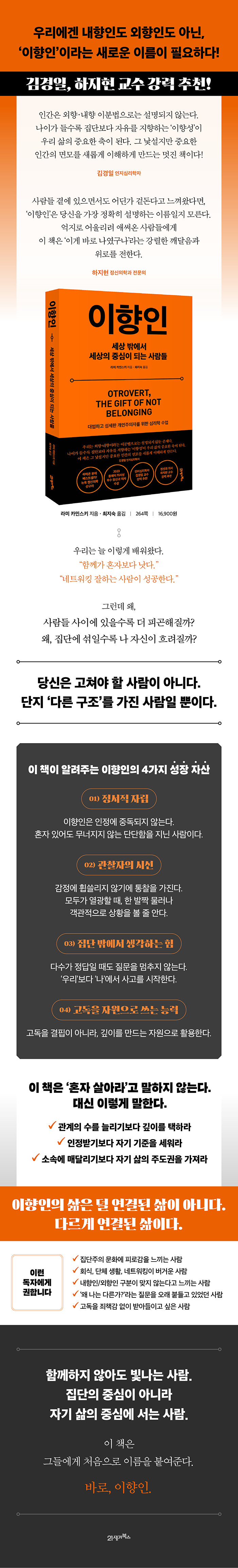 ÀÌ Ã¥ÀÇ ÀúÀÚÀÎ ´º¿åÀÇ Àú¸íÇÑ Á¤½Å°ú ÀÇ»ç ¶ó¹Ì Ä«ÀνºÅ° ¹Ú»ç´Â ÀÌ Áú¹®¿¡ ´äÇϱâ À§ÇØ ÇϳªÀÇ À̸§À» Á¦½ÃÇÑ´Ù. ¹Ù·Î 'ÀÌÇâÀÎ(¿ÀÆ®·Î¹öÆ®)'. ÀÌÇâÀÎÀº »ç¶÷À» ½È¾îÇÏ´Â À̵µ, »çȸ¼ºÀÌ ºÎÁ·ÇÑ À̵µ ¾Æ´Ï´Ù. ´Ù¸¸ ¿¡³ÊÁö¸¦ ¾ò´Â ¹æ½ÄÀÌ ´Ù¸£°í, ¾ÈÁ¤°¨À» ´À³¢´Â ±¸Á¶µµ ´Ù¸£¸ç, »ç°íÀÇ Ãâ¹ßÁ¡ÀÌ ¡®¿ì¸®¡¯°¡ ¾Æ´Ï¶ó ¡®³ª¡¯ÀÎ »ç¶÷ÀÌ´Ù. Áý´Ü ¼Ó¿¡ ÀÖÀ» ¶§ ¿ÀÈ÷·Á ´õ ¿Ü·Ó°í, È¥ÀÚ ÀÖÀ» ¶§ °¡Àå ÀÚ¿¬½º·¯¿öÁö´Â »ç¶÷. ¸ðµÎ°¡ ¿Ç´Ù°í ¸»ÇÒ ¶§ ÇÑ °ÉÀ½ ¹°·¯¼¼ ¿Ö ¿ÇÀºÁö ¹¯´Â »ç¶÷. ŸÀÎÀÇ ¹Ú¼öº¸´Ù Àڱ⠱âÁØÀ» ´õ ½Å·ÚÇÏ´Â »ç¶÷.