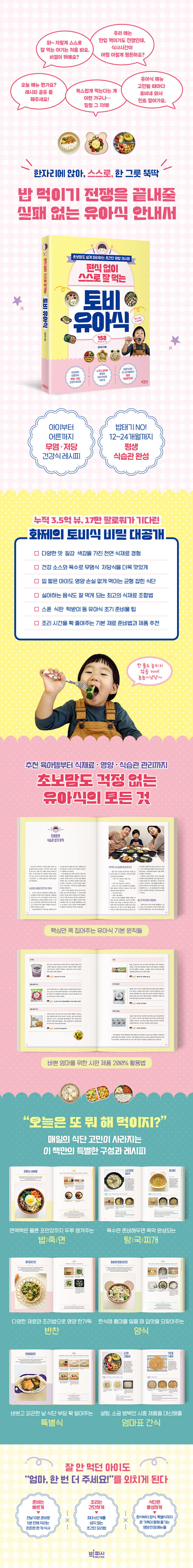 ¡°¿À´Ã ¸Þ´º ¹º°¡¿ä? ·¹½ÃÇÇ °øÀ¯ Á» ÇØÁÖ¼¼¿ä!¡±¿Í °°Àº ¿äûÀÌ ½ñ¾ÆÁ³°í, Åäºñ¸¾Àº ±×µ¿¾È Á÷Á¢ ½ÇõÇÏ¸ç ½×¾Æ¿Â À¯¾Æ½Ä ³ëÇϿ츦 ÀÌ ÇÑ ±ÇÀÇ Ã¥¿¡ °í½º¶õÈ÷ ´ã¾Æ³Â´Ù. »ýÈÄ 11°³¿ù ÀüÈĺÎÅÍ 24°³¿ù ¹«·Æ±îÁö À̾î¿Â Åäºñ½ÄÀÇ °¡Àå Å« Ư¡Àº ¹Ù·Î ¡®¹«¿° À¯¾Æ½Ä¡¯ ¿øÄ¢ÀÌ´Ù. ÀúÀÚ´Â ¼Ò±Ý°ú °£Àå ¾øÀ̵µ ÃæºÐÈ÷ ¸ÀÀÖ°Ô, ä¼Ò¿Í À°¼öÀÇ Ãµ¿¬ °¨Ä¥¸ÀÀ» »ì¸®°í °Ç° ¼Ò½º·Î dz¹Ì¸¦ ´õÇÏ´Â ¹æ¹ýÀ» ±¸Ã¼ÀûÀ¸·Î ¾È³»ÇÑ´Ù. ¶ÇÇÑ ÇÑ ¹ø °ÅºÎÇß´Ù°í Æ÷±âÇÏÁö ¾Ê°í ¸ð¾ç°ú Á¶¸®¹ýÀ» ¹Ù²ã ´Ù½Ã °æÇèÇÏ°Ô ÇÏ´Â ¹Ýº¹ÀÇ Èû°ú °¿äÇÏÁö ¾Ê´Â ŵµ°¡ °á±¹ Æí½Ä ¾ø´Â ½Ä½À°üÀ» ¸¸µé¾îÁØ´Ù°í °Á¶ÇÑ´Ù.