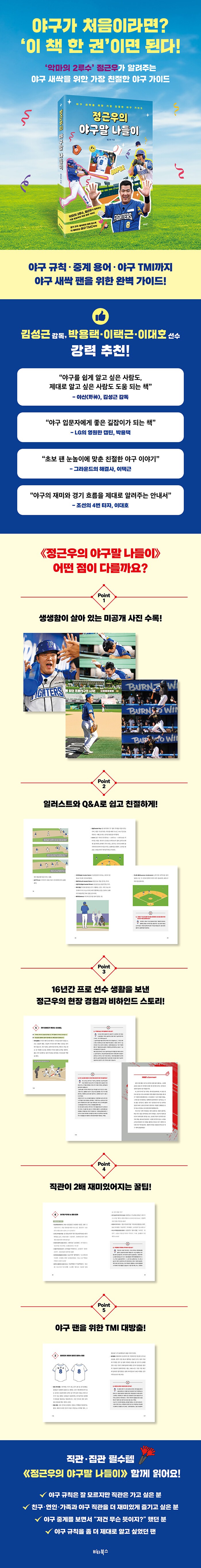 ÇÁ·Î ¾ß±¸ ¼±¼ö·Î¼ ¿À·£ ½Ã°£À» ÇöÀå¿¡¼ º¸³½ Á¤±Ù¿ìÀÇ °æÇèÀº ÀÌ Ã¥¿¡ Çö½Ç°¨À» ´õÇÑ´Ù. ¾ß±¸´Â ´Ü¼øÇÑ °æ±â ±ÔÄ¢ÀÇ ÁýÇÕÀÌ ¾Æ´Ï¶ó, È帧°ú ºÐÀ§±â, »ç¶÷µéÀÌ ÆÀÀ» ÀÌ·ï ¸¸µé¾î°¡´Â À̾߱â¶ó´Â Á¡À» ÀÚ¿¬½º·´°Ô ÀüÇϸç, µ¶ÀÚ°¡ ¾ß±¸¸¦ Áñ±â¸é¼ ÀÌÇØÇÒ ¼ö ÀÖµµ·Ï ¾È³»ÇÑ´Ù.