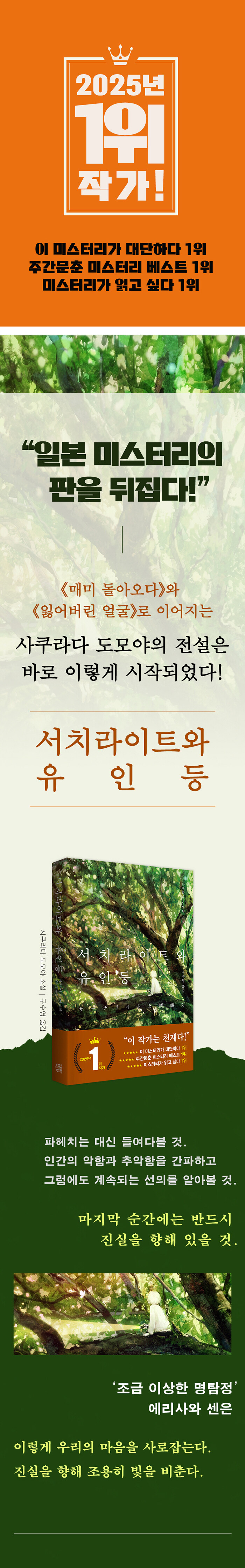 2025³âÀº ÇѸ¶µð·Î »çÄí¶ó´Ù µµ¸ð¾ßÀÇ ÇØ¿´´Ù. ÀåÆí¼Ò¼³ ¡¶ÀÒ¾î¹ö¸° ¾ó±¼¡··Î ¡®¹Ì½ºÅ͸®°¡ ÀÐ°í ½Í´Ù!¡¯ 1À§, ¡®ÁÖ°£¹®Ãá ¹Ì½ºÅ͸® º£½ºÆ®¡¯ 1À§, ¡®ÀÌ ¹Ì½ºÅ͸®°¡ ´ë´ÜÇÏ´Ù!¡¯ 1À§. ÁÖ¿ä ¹Ì½ºÅ͸® ·©Å·À» ÈÛ¾µ¸ç ±×ÇØ ÀϺ» ¹Ì½ºÅ͸®ÀÇ Á߽ɿ¡ ¼± °Í. ÀÌ¿¡ ÀÚ¿¬½º·´°Ô ¶°¿À¸£´Â Áú¹®ÀÌ ÀÖ´Ù. ÀÌ ÀÛ°¡ÀÇ Ãâ¹ßÁ¡¿¡ °ú¿¬ ¹«¾ùÀÌ ÀÖ¾úÀ»±î. Àΰ£ÀÇ ¾îµÒ°ú ¼±ÀǸ¦ µ¿½Ã¿¡ ºñÃß´Â ¡®µû¶æÇÑ ¹Ì½ºÅ͸®¡¯ÀÇ °¡´É¼ºÀ» ¾î¶»°Ô ÀÌÅä·Ï °ß°íÇÏ°Ô ½×¾Æ¿Ã¸° °ÍÀϱî. ¡¶¼Ä¡¶óÀÌÆ®¿Í À¯Àε¿¡¼ »çÄí¶ó´Ù µµ¸ð¾ß¶ó´Â ÀÛ°¡ÀÇ Ãʼ®°ú Á¤¼ö¸¦ µ¿½Ã¿¡ ¿³º¼ ¼ö ÀÖ´Ù.