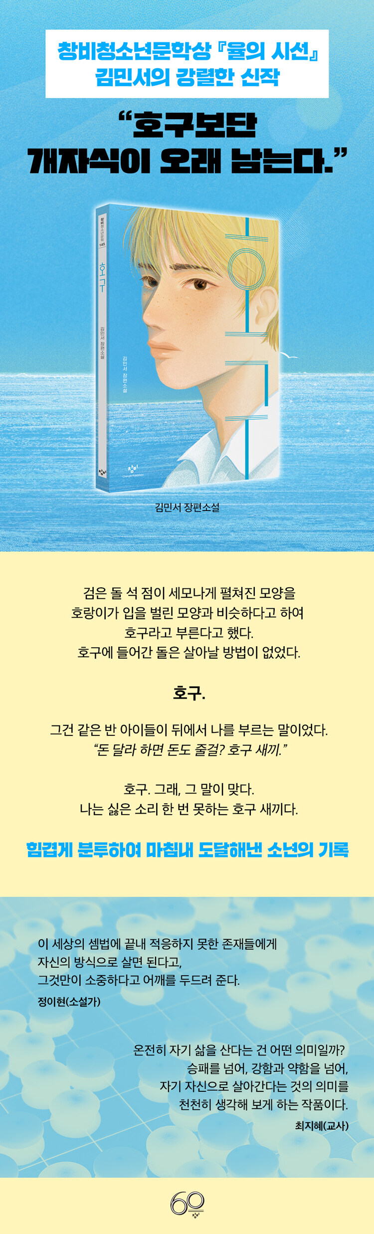 ¡ºÀ²ÀÇ ½Ã¼±¡»À¸·Î Á¦17ȸ âºñû¼Ò³â¹®ÇлóÀ» ¼ö»óÇÏ¸ç µ¶Àڵ鿡°Ô Å« »ç¶ûÀ» ¹ÞÀº ±è¹Î¼ÀÇ ½ÅÀÛ ÀåÆí¼Ò¼³ ¡ºÈ£±¸¡»(âºñû¼Ò³â¹®ÇÐ 145)°¡ Ãâ°£µÇ¾ú´Ù. ¡ºÀ²ÀÇ ½Ã¼±¡»¿¡¼ ÀڽŸ¸ÀÇ ´ÝÈù ¼¼°è¿¡ ŸÀÎÀ» ¹Þ¾ÆµéÀÌ¸ç »ý°Ü³ª´Â ±Õ¿À» ¼¶¼¼ÇÑ ½Ã¼±À¸·Î ´ã¾Ò´ø ÀÛ°¡´Â À̹ø ÀÛǰ¿¡¼ ¼¼»ó°ú ºÎµúÄ¡¸ç À§ÅÂ·Ó°Ô Èçµé¸®´Â ¼Ò³âÀÇ ¼ºÀåÀ» °·ÄÇÏ°Ô ¼±º¸ÀδÙ. ÂøÇϰԸ¸ »ì¾Æ¿Ô´ø ÁÖÀΰø ¡®À±¼ö¡¯°¡ °ÇÏ°í ³ª»Û ¾ÆÀ̰¡ µÇ±â·Î °á½ÉÇÏ¸é¼ ¹ú¾îÁö´Â À̾߱â·Î, ÀÚ½ÅÀÇ ¿å¸ÁÀ» Ä¡¿ÇÏ°Ô µé¿©´Ùº¸°í »î°ú Çູ¿¡ ´ëÇÑ ´äÀ» ã¾Æ°¡´Â °úÁ¤ÀÌ ¶ß°Ì°Ô ´ã°å´Ù. ¡®È£±¸(ûÛÏ¢)¡¯¶õ º»·¡ ¡®È£¶ûÀÌÀÇ ÀÔ¡¯À̶ó´Â ¶æÀ¸·Î ¹ÙµÏ¿¡¼ ¼¼ µ¹¿¡ µÑ·¯½Î¿© À§ÅÂ·Î¿î »óȲÀ» À̸£´Â ¸»ÀÌ´Ù. ¡®È£±¸¡¯ ¼Ó¿¡¼ »ì¾Æ³²±â À§ÇØ ÀÚ½ÅÀ» º·Á ³½ ¼Ò³âÀÇ °í¹Î°ú ±ú´ÞÀ½ÀÌ ¹ÙµÏ ´ë±¹¿¡ ºñÀ¯µÇ¸ç °¨µ¿ÀûÀ¸·Î ÆîÃÄÁø´Ù. ÁøÂ¥ ¡®³ª¡¯ ±×¸®°í ÁøÁ¤ÇÑ Çູ¿¡ µµ´ÞÇϱâ À§ÇØ ÃÖ¼±ÀÇ ¼ö¸¦ ã¾Æ Çì¸Å´Â ¸ðµç À̵éÀ» À§ÇÑ ¼Ò¼³ÀÌ´Ù.
