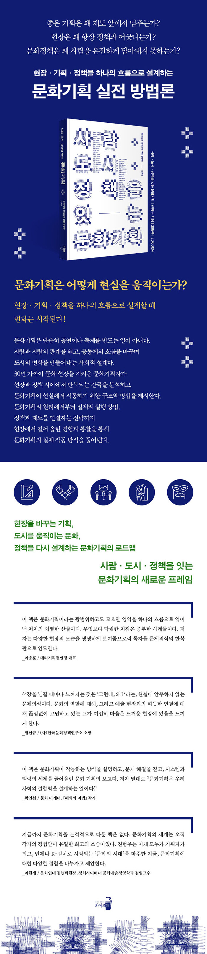 ÀÌ Ã¥Àº ¹Ù·Î ÀÌ·¯ÇÑ ¹®Á¦ÀǽĿ¡¼ Ãâ¹ßÇß´Ù. 30³â °¡±îÀÌ ¹®È ÇöÀåÀ» ÁöÄѿ ¹®È±âȹÀÚ°¡ ÀÚ½ÅÀÇ °æÇè°ú °í¹ÎÀ» ¹ÙÅÁÀ¸·Î ¹®È±âȹÀ̶õ °ú¿¬ ¹«¾ùÀ̸ç, ¾î¶² °üÁ¡°ú ¹æ½ÄÀ¸·Î ±âȹ°ú Á¤Ã¥À» ±¸ÇöÇØ³¾ °ÍÀÎÁö, ±×¸®°í Á¦µµ¿Í Á¤Ã¥ÀÇ ÇÑ°è ¼Ó¿¡¼ ¹®ÈÁ¤Ã¥ÀÌ ³ª¾Æ°¡¾ß ÇÒ ¹æÇâ±îÁö ¸ð»öÇϰí ÀÖ´Ù. ¹®È±âȹÀÌ ´Ü¼øÇÑ Á÷¾÷À̳ª ±â¼úÀÌ ¾Æ´Ï¶ó ¿ì¸® »çȸÀÇ º¯È¸¦ ÀÐ°í ¸¸µé¾î°¡´Â ÇϳªÀÇ ½Çõ Àü·«À̶ó´Â Á¡À», ÇöÀå¿¡¼ ±æ¾î ¿Ã¸° ¹«¼öÇÑ À̾߱âµéÀ» ÅëÇØ ¼³µæ·Â ÀÖ°Ô Á¦½ÃÇÑ´Ù.