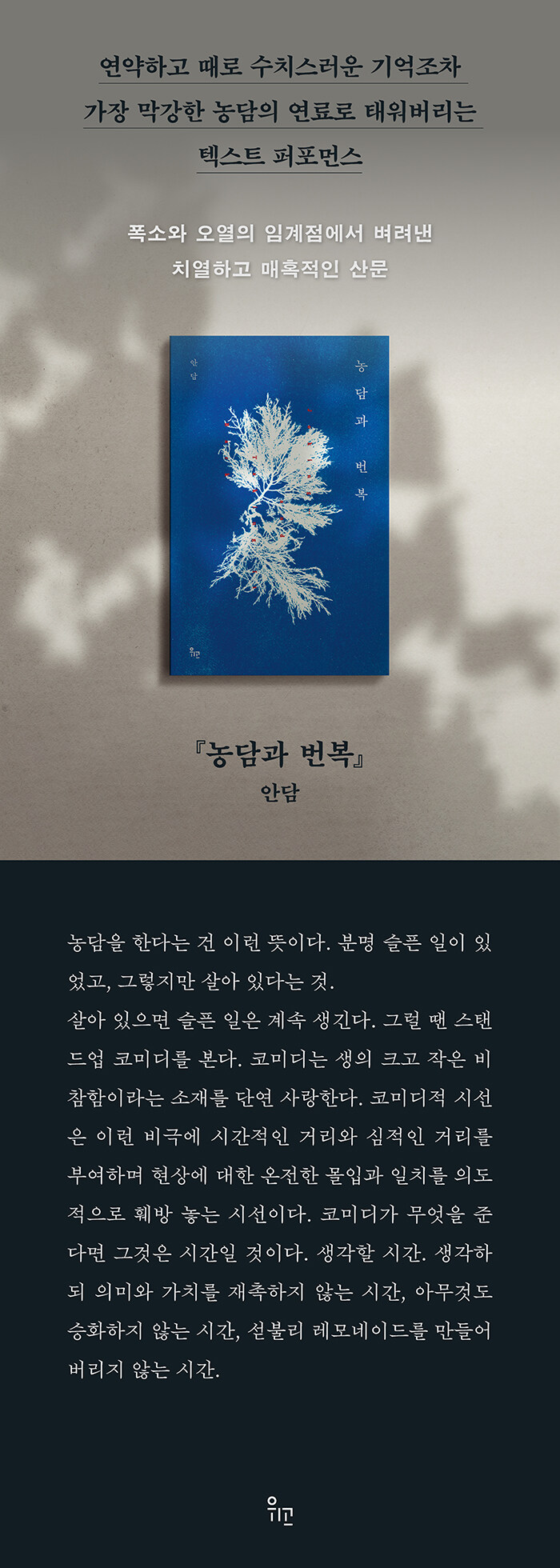 ³ó´ãÀº ´Ü¼øÈ÷ ¿ôÀ½ÀÇ ±â¼úÀÌ ¾Æ´Ï¶ó °ü°è¿Í °Å¸®, ¿å¸Á°ú ¼öÄ¡½É, »ç¶û°ú ½ÇÆÐ°¡ µ¿½Ã¿¡ µå·¯³ª´Â ¸»ÀÇ Çü½ÄÀÌ´Ù. ÀÌ Ã¥Àº ±× À§ÅÂ·Î¿î ¸»ÇϱâÀÇ Àå¸éµéÀ» µû¶ó°¡¸ç, ¿ì¸®°¡ ¿Ö ³¡³» ³ó´ãÇÏ°í ¹øº¹Çϱ⸦ ¸ØÃßÁö ¾Ê´ÂÁö¸¦ º¸¿©ÁØ´Ù. Á¶¿ëÇϰí Á¤±³ÇÑ ¹®ÀåÀ¸·Î ¿ôÀ½ ÀÌÈÄ¿¡ ³²´Â °¨°¢À» ¿À·¡ ºÙµé°í ³õÁö ¾Ê´Â ÀÌ Ã¥Àº ¿ì¸®°¡ ¾ó¸¶³ª ÀÚÁÖ Æ²¸®°í, ¾ó¸¶³ª ÀÚÁÖ µ¹¾Æ¿À¸ç, ±×·³¿¡µµ ´Ù½Ã ¸»ÇÏ°í ´Ù½Ã »ì¾Æ°¡·Á ÇÏ´Â Á¸ÀçÀÎÁö¸¦ ³¡±îÁö ¹Ð¾îºÙÀδÙ.