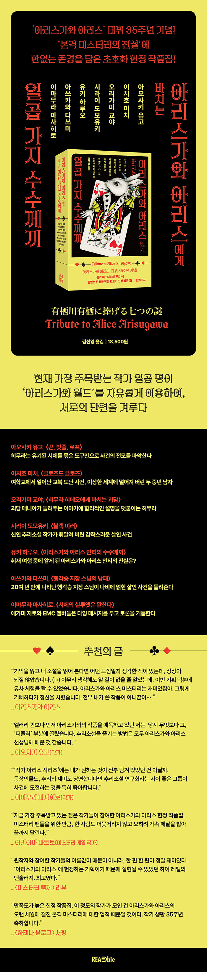 ¡®º»°Ý ¹Ì½ºÅ͸®ÀÇ Àü¼³¡¯ ¾Æ¸®½º°¡¿Í ¾Æ¸®½ºÀÇ µ¥ºß 35ÁÖ³âÀ» ±â³äÇÏ´Â ÇåÁ¤ ÀÛǰÁý. ¾Æ¸®½º°¡¿Í ¾Æ¸®½º´Â 1989³â ¡¶¿ù±¤ °ÔÀÓ - YÀÇ ºñ±Ø ¡®88¡··Î µ¥ºßÇÑ ÀÌ·¡, ÀÛǰÀº ¹°·Ð ¼ö¸¹Àº ÈÄÇÐÀ» ¾ç¼ºÇÏ¸ç ¹Ì½ºÅ͸®ÀÇ ÇÑ ÃàÀ» ´ã´çÇØ ¿Ô´Ù. ´ëÀÛ°¡ÀÇ 35ÁÖ³âÀ» ±â³äÇϱâ À§ÇØ, ¾Æ¸®½º°¡¿Í ¾Æ¸®½ºÀÇ Ç¥ÇöÀ» ºô¸é, ¡¯ÀâÁö ¸ñÂ÷¿¡ ÀÖÀ¸¸é À̸§¿¡¼ ºûÀÌ ³ª´Â¡® Àαâ ÀÛ°¡µéÀÌ ¼Ó¼Ó Âü¿©Çß´Ù.
