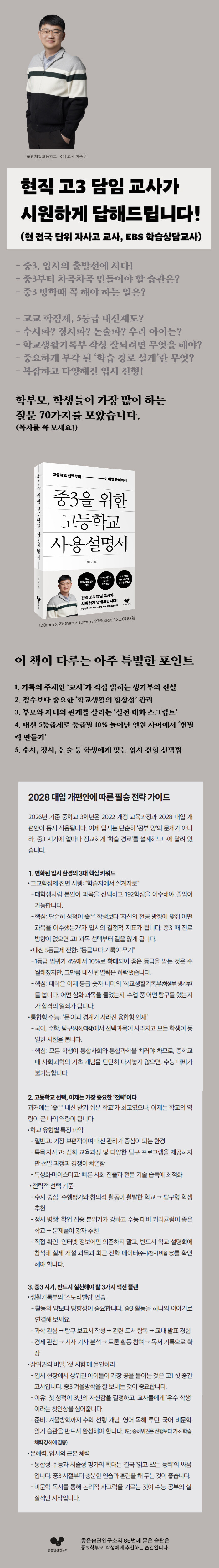 ÀÌ Ã¥Àº ÀÌ·¯ÇÑ °í¹Î¿¡¼ Ãâ¹ßÇØ Áß3 ½ÃÁ¡¿¡¼ ¹Ýµå½Ã ¾Ë¾Æ¾ß ÇÒ °íµîÇб³ ¼±Åðú °í±³ 3³âÀÇ ÇнÀ Àü·«, ±×¸®°í ´ëÀÔ ÁغñÀÇ ¹æÇâÀ» ü°èÀûÀ¸·Î Á¤¸®ÇÑ ¾È³»¼´Ù. ÇöÁ÷ ±³»ç°¡ Çб³ ÇöÀå¿¡¼ Çлý°ú Çкθ𸦠»ó´ãÇÏ¸ç °¡Àå ¸¹ÀÌ ¹Þ¾Ò´ø Áú¹®À» Áß½ÉÀ¸·Î, °íµîÇб³ ÀÔÇÐ ÀüºÎÅÍ ÁغñÇØ¾ß ÇÒ ÇÙ½É »çÇ×°ú ½ÇÁ¦ Çб³»ýȰ¿¡¼ ½×¾Æ¾ß ÇÒ °æÇèµéÀ» ±¸Ã¼ÀûÀ¸·Î ¼³¸íÇÑ´Ù.