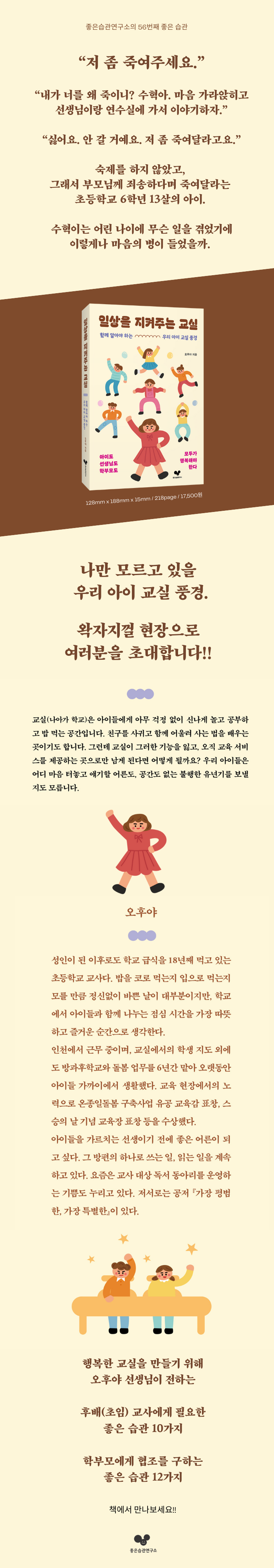 ÃÊµî ±³»ç·Î 18³â°£ ¾ÆÀ̵é°ú ÇÔ²²Çؿ ÀúÀÚ ¿ÀÈÄ¾ß ¼±»ý´ÔÀÇ ±³½Ç À̾߱⸦ ´ãÀº ¿¡¼¼ÀÌ´Ù. ¾î´À ³¯ °©Àڱ⠱³»ç ÀÏÀÌ ¹ö°Ì°Ô ´À²¸Á³´ø ¼±»ý´ÔÀº ÈÞÁ÷À» ÇÏ´Â µ¿¾È ¡®¾ÆÀ̵é°ú ÇÔ²²ÇÑ ÀÏ»ó¡¯ÀÇ Àǹ̸¦ µÇ¤À¸¸ç ÀÌ Ã¥À» ¾²±â ½ÃÀÛÇß´Ù. ¾ÆÀ̰¡ Áö¿ì°³¸¦ ÀÒ¾î¹ö·Á ±Þ½ÄÀ» ¸ø ¸Ô°Ú´Ù¸ç ¿ï´ø ÀÏ, ¼±»ý´Ô¿¡°Ô ¡°½Å°æ ²ô¼¼¿ä!¡±¶ó°í ¸»ÇÏ´ø ¾ÆÀ̸¦ ´Ùµ¶ÀÎ ¼ø°£, ¾¿¾¿ÇÏ°í ¿Á¤ÀûÀ̾ú´ø ¿· ¹Ý ¼±»ý´ÔÀ» ½Å°æÁ¤½Å°ú º´¿ø¿¡¼ ¸¶ÁÖÄ£ ÀÏ µî. ¾î´À ±³»çÀÇ °³ÀÎÀû °æÇèÀÌÁö¸¸, °¢°¢ÀÇ À̾߱Ⱑ ÀüÇÏ´Â ¸Þ½ÃÁö´Â Çб³¿Í Çкθ𠳪¾Æ°¡ ±³À° ´ç±¹ÀÚ°¡ ÇÔ²² °í¹ÎÇØ¾ß ÇÒ ¹®Á¦À̱⵵ ÇÏ´Ù. ±³±Ç°ú ÀαÇÀÌ ¼·Î ´ë¸³ÇÏ´Â °ÍÀÌ ¾Æ´Ñ °Íó·³, ÇູÇÑ ¡®±³½Ç¡¯À» ¸¸µé±â À§ÇØ ±³»ç¿Í Çкθ𰡠ÇÔ²² Àо¸é ÁÁ°Ú´Ù. Ã¥ ³¡¿¡´Â ±³»ç¿Í ºÎ¸ð°¡ ÁöÄÑ¾ß ÇÒ ½À°ü 22°¡Áöµµ ÇÔ²² Á¦½ÃÇØ ½ÇõÀû ÁöħÀ» º¸¿ÏÇß´Ù.