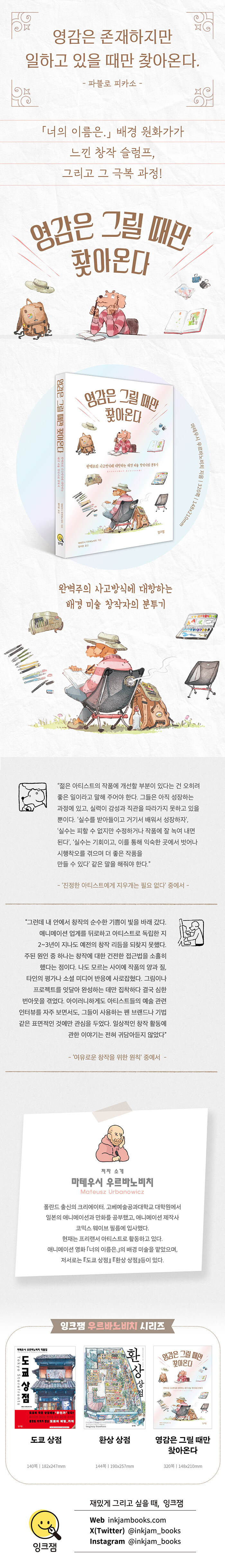 ÀÌ Ã¥Àº ¸¸ÈÀÇ º»°íÀå ÀϺ»¿¡¼ »ý¸í·ÂÀÌ ´À²¸Áö´Â µû¶æÇÑ ±×¸²À¸·Î ½Ç·ÂÀ» ÀÎÁ¤¹Þ¾Æ ¿Â Æú¶õµå Ãâ½Å ÀÛ°¡°¡, ½º½º·Î ¼¼¿î ÀÌ»ó°ú ¿Ïº®ÁÖÀÇÀÇ ¾Ð¹Ú ¼Ó¿¡¼ ¸¶ÁÖÇÏ°Ô µÈ ¡®°í¹Î¡¯¿¡¼ Ãâ¹ßÇß´Ù. ¡®³ª´Â ¾ÆÆ¼½ºÆ®·Î¼ ¹«¾ùÀ» ¸»ÇÏ°í ½ÍÀº°¡?¡¯, ¡®ÃÖ°íÀÇ ÀÛǰÀ» ¸¸µé·Á¸é ¹«¾ùÀÌ ÇÊ¿äÇÒ±î?¡¯, ¡®ºÎ´ã°¨ ¾øÀÌ Ã¢ÀÛ¿¡ ¸ôµÎÇÒ ¼ø ¾øÀ»±î?¡¯ ¼ö¸¹Àº Áú¹®ÀÇ ÇØ´äÀ» ã±â À§ÇØ ÀúÀÚ´Â 2018³âºÎÅÍ ÀÚ½ÅÀÇ Ã¢ÀÛ ¹æ½Ä°ú ŵµ, ¿¹¼ú°¡·Î¼ÀÇ »îÀ» µ¹¾Æº¸¸ç ºí·Î±×¿¡ ±ÛÀ» ³²±â±â ½ÃÀÛÇß´Ù. ÀÌ ±â·ÏÀ» ¹ÙÅÁÀ¸·Î ±ÛÀ» ÆíÁýÇϰí, ´Ù½Ã ¾²°í, ÀÏ·¯½ºÆ®¸¦ µ¡ºÙ¿© ÇÑ ±ÇÀÇ ¿¡¼¼ÀÌ·Î ¿«¾ú´Ù.