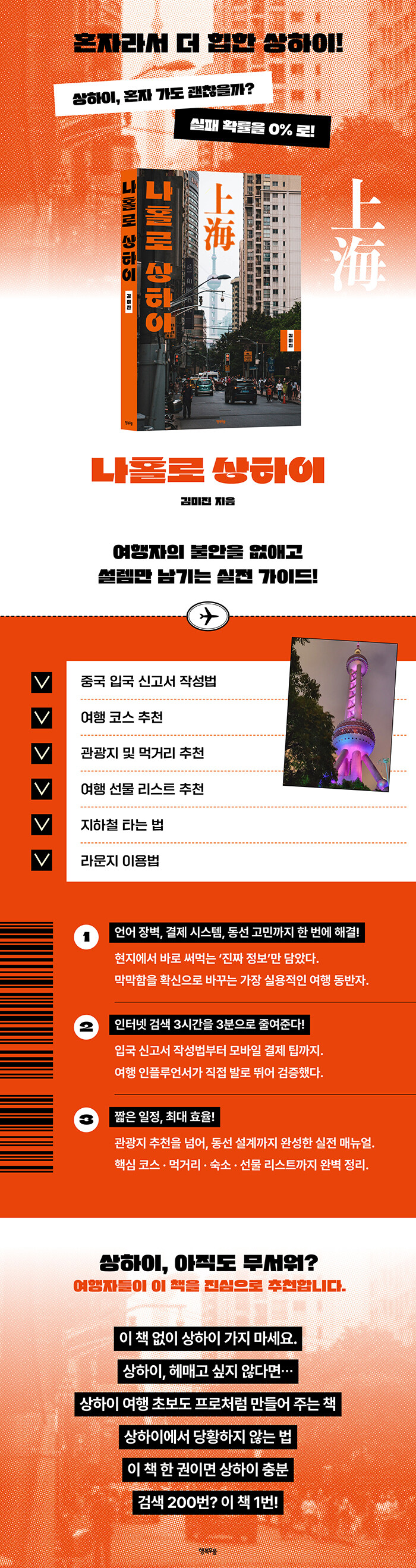 Áß±¹Àº ¿ì¸®¿¡°Ô °¡±î¿î ³ª¶óÁö¸¸, ¸·»ó ¿©ÇàÀ» È¥ÀÚ °¡·Á¸é ¸Á¼³¿©Áö´Â °÷ÀÌ´Ù. ¾ð¾îÀû À庮»Ó¸¸ ¾Æ´Ï¶ó Çѱ¹°ú´Â ´Ù¸¥ ¸ð¹ÙÀÏ °áÁ¦ ½Ã½ºÅÛ µîÀ¸·Î È¥¼±À» °ÞÀ» ¼ö Àֱ⠶§¹®ÀÌ´Ù. ±×·² ¶§ ¿·¿¡¼ Ä£±¸Ã³·³ Á¶¾ðÇØ ÁÖ´Â ½Å·Ú°¨ Àִ åÀÌ ÀÖ´Ù¸é ¾î¶³±î. ÀÎÅͳݿ¡ ¶°µµ´Â Á¤º¸µéÀÌ ¾Æ´Ñ, ¿©Çà ÀÎÇ÷ç¾ð¼ÀÎ ÀúÀÚ°¡ Á÷Á¢ ¹ßǰÆÈ¾Æ ã¾Æ³½ ÁÖ¿Á°°Àº Á¤º¸¿Í ÆÁµé·Î °¡µæÇÑ Ã¥ ¸»ÀÌ´Ù. ¡´³ªÈ¦·Î »óÇÏÀÌ¡µ´Â ªÀº ±â°£ µ¿¾È »óÇØ¸¦ Áñ±æ ¼ö ÀÖ´Â ³ëÇÏ¿ì¿Í À̾߱âµéÀ» º¸±â ÁÁ°Ô ±¸¼ºÇÑ Ã¥ÀÌ´Ù. ÀÌ Ã¥ÀÌ ´Ü±â ¿©ÇàÀڵ鿡°Ô Ưº°È÷ ¸Å·ÂÀûÀÎ Á¡Àº, ¸¹Àº ¿©ÇàÀÚµéÀÌ ½±°Ô Áö³ªÄ¥ ¼ö ÀÖÁö¸¸ Áß¿äÇÑ »óÇÏÀÌ ¿©ÇàÀÇ Çʼö üũ¸®½ºÆ®, ¼÷¼Ò Á¤º¸ µîÀÌ »ó¼¼ÇÏ°Ô ³ª¿ÍÀֱ⠶§¹®ÀÌ´Ù. ¿¹¸¦ µé¾î, Áß±¹ ÀÔ±¹ ½Å°í¼ ÀÛ¼º¹ý, ¿©Çà ÄÚ½º Ãßõ, °ü±¤Áö ¹× ¸Ô°Å¸® Ãßõ, ¿©Çà ¼±¹° ¸®½ºÆ® Ãßõ µî ¿©ÇàÀÚ¶ó¸é °í¹ÎÇØºÃÀ» ¸¸ÇÑ ÁÖÁ¦¿¡ ´ëÇÑ ÀúÀÚ¸¸ÀÇ Æ¯º°ÇÑ ¼Ö·ç¼Ç»Ó¸¸ ¾Æ´Ï¶ó, ÁöÇÏö Ÿ´Â ¹ý, ¶ó¿îÁö ÀÌ¿ë¹ý µî ¹Ù·Î ¿©Çà¿¡ »ç¿ëÇÒ ¼ö ÀÖ´Â ½Ç¿ëÀûÀÎ ¿©Çà ÆÁµéÀÌ Á¦½ÃµÇ¾î ÀÖ´Ù. ±×³àÀÇ Æ¯º°ÇÏ°íµµ ½Ç¿ëÀûÀÎ ¿©Çà ±â·ÏÀ» µû¶ó°¡´Ù¸é °¡Àå È¿À²ÀûÀÌ¸é¼ Áñ°Ì°Ô »óÇÏÀ̸¦ Áñ±æ ¼ö ÀÖ´Â ¹æ¹ýÀ» ¹ß°ßÇÏ°Ô µÇ´Â Çà¿îÀ» ´©¸± ¼ö ÀÖÀ» °ÍÀÌ´Ù.