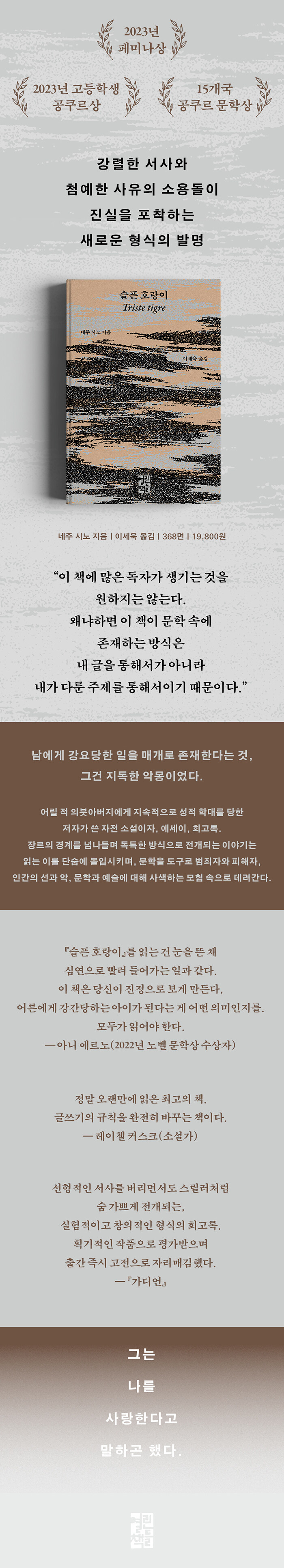 ³×ÁÖ ½Ã³ë´Â Àڱ⠵þ¾ÆÀ̸¦ º¸¸ç ÀÚ½ÅÀÇ ¾î¸° ½ÃÀýÀ» ´Ù½Ã±Ý ¶°¿Ã¸°´Ù. ¾Ç¿¡¼ ¹þ¾î³ª°íÀÚ ¸Ö¸® µµ¸ÁÃÄ ¿ÔÁö¸¸, ±× ¾ÇÀº ¿©ÀüÈ÷ ±×³à ¼¼°èÀÇ ¾îµÎ¿î Á߽ɿ¡ ÀÚ¸®Çϰí ÀÖ¾ú´Ù. ºí·¹ÀÌÅ©ÀÇ ½Ã ¡¸È£¶ûÀÌThe Tyger¡¹ ¼Ó ¡´±×ºÐÀº ¾î¸°¾çÀ» ¸¸µé°íµµ ±×´ë¸¦ ¸¸µé¾ú´Â°¡?¡µ¶ó´Â ½Ã±¸¸¦ °¹ÚÀûÀ¸·Î ¶°¿Ã¸®¸ç, °°£¹ü°ú ÀÚ±â ÀÚ½ÅÀÌ °°Àº ÈëÀ¸·Î ºú¾îÁ³´Â°¡ Çϴ ȵθ¦ ²÷ÀÓ¾øÀÌ »çÀ¯ÇÑ´Ù. ¿©¼º¿¡ ´ëÇÑ Æø·ÂÀ» ÁÖÁ¦·Î ÇÑ Áýȸ¸¦ °è±â·Î, ³×ÁÖ ½Ã³ë´Â ÀÚ½ÅÀÇ À̾߱⸦ Á¦´ë·Î µé·ÁÁÖ¸®¶ó ¸¶À½¸Ô´Â´Ù. ±×³à´Â Á¶±Ý¾¿ ¾´ ±ÛÀ» ¸ß½ÃÄÚÀÇ ¹®ÇÐ µ¿Àεé°ú ³ª´« ÈÄ ÇÁ¶û½º¾î·Î ´Ù½Ã ¾²´Â Ưº°ÇÑ ¹æ½ÄÀ¸·Î ±ÛÀ» ½á³ª°£´Ù. ºí¶óµð¹Ì¸£ ³ªº¸ÄÚÇÁ, ¹öÁö´Ï¾Æ ¿ïÇÁ, ¾Æ´Ï ¿¡¸£³ë, Åä´Ï ¸ð¸®½¼, Áú µé·ÚÁî, Ŭ·Îµå ÆþƼ, µðµð¿¡ ¿¡¸®ºÀ µî À帣¿Í ¾ð¾î¸¦ ³Ñ³ªµå´Â ¹®ÇÐ ÀÛǰµé°ú ´ëÈÇÏ¸ç ±íÀÌ »çÀ¯ÇÏ´Â ½Å¼±ÇÏ°í °ÝÁ¶ ³ôÀº ¹æ½ÄÀ¸·Î ¾´, ÀÚÀü ¼Ò¼³ÀÌÀÚ ¿¡¼¼ÀÌ, ȸ°í·ÏÀÎ ¡º½½Ç ȣ¶ûÀÌ¡»¸¦ 2023³â ¸¶Ä§³» Ãâ°£ÇÑ´Ù.