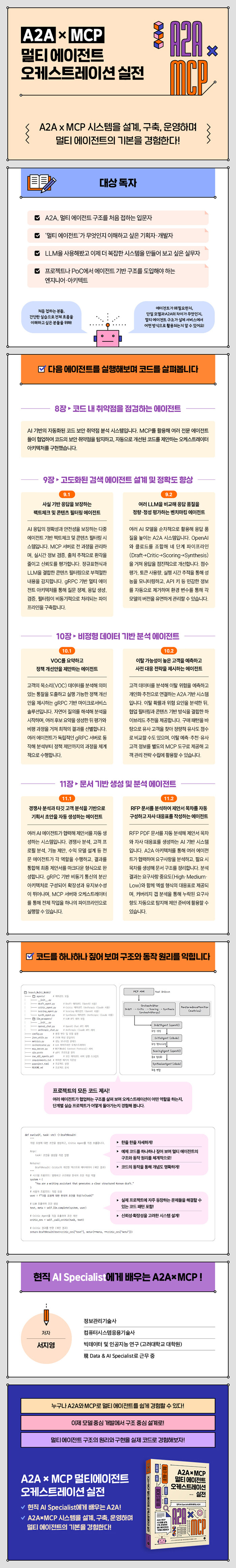 ÇϳªÀÇ ¸ðµ¨ÀÌ ¸ðµç °ÍÀ» ÇØ°áÇÏ´ø ¹æ½Ä¿¡¼ ¹þ¾î³ª, ¿©·¯ AI ¿¡ÀÌÀüÆ®°¡ °¢ÀÚÀÇ ¿ªÇÒÀ» ³ª´©°í Çù·ÂÇÏ´Â A2A(Agent-to-Agent) ¸ÖƼ ¿¡ÀÌÀüÆ® ±¸Á¶°¡ »õ·Î¿î Ç¥ÁØÀ¸·Î ¶°¿À¸£°í ÀÖ½À´Ï´Ù. A2A¿Í ¸ÖƼ ¿¡ÀÌÀüÆ®´Â ¾ÕÀ¸·Î AI ½Ã½ºÅÛÀÇ ÇÙ½É ±¸Á¶°¡ µÉ °ÍÀÔ´Ï´Ù. ÀÌ Ã¥Àº ÀÌ·¯ÇÑ º¯È¿¡ ¸ÂÃç ¸ÖÆ¼ ¿¡ÀÌÀüÆ® ½Ã½ºÅÛÀ» ´õ ½±°Ô ÀÌÇØÇÒ ¼ö ÀÖµµ·Ï, ½Ç½À ÇÁ·ÎÁ§Æ® Áß½ÉÀ¸·Î ±¸¼ºÇß½À´Ï´Ù. Àϰö °¡Áö ¼·Î ´Ù¸¥ A2A ½Ç½À ½Ã³ª¸®¿À¸¦ ÅëÇØ, ¿©·¯ ¿¡ÀÌÀüÆ®°¡ Çù·ÂÇØ ¹®Á¦¸¦ ÇØ°áÇÏ´Â ¹æ½ÄÀ» °æÇèÇØº¾´Ï´Ù. ´Ü°èº° ÇÁ·ÎÁ§Æ®¸¦ µû¶ó°¡¸ç ¿¡ÀÌÀüÆ®°¡ ¾î¶»°Ô Çù·ÂÇϰí, ¿ÀÄɽºÆ®·¹À̼ÇÀ» ÅëÇØ ¾î¶² ¹æ½ÄÀ¸·Î Àüü ½Ã½ºÅÛÀÌ ¿¬°áµÇ´ÂÁö ÀÚ¿¬½º·´°Ô ÀÌÇØÇÕ´Ï´Ù. ¶ÇÇÑ gRPC ±â¹Ý ¿¡ÀÌÀüÆ® È£Ãâ, Æò°¡-°³¼± ·çÇÁ, ¹®¼ ±â¹Ý RAG µî ½ÇÁ¦ AI ¼ºñ½º¿¡¼ Ȱ¿ëµÇ´Â ±¸Á¶¸¦ ÄÚµå¿Í ÇÔ²² »ìÆìº¼ ¼ö ÀÖ½À´Ï´Ù. °¢ ÇÁ·ÎÁ§Æ®´Â ¡°º¹ÀâÇÑ ¹®Á¦Àϼö·Ï ¿ªÇÒÀ» ³ª´©°í È帧À» ¼³°èÇÏ´Â °ÍÀÌ °·ÂÇÑ Àü·«ÀÌ µÈ´Ù¡±´Â A2AÀÇ ÇÙ½É ¿ø¸®¸¦ Àß º¸¿©ÁÙ ¼ö ÀÖµµ·Ï ÁغñÇß½À´Ï´Ù. Ã¥ÀÇ ÇÁ·ÎÁ§Æ® ¿Ü¿¡µµ °í°´ ÀÀ´ë, ¹®¼ °ËÁõ, ºÐ¼®°ú ¸®¼Ä¡, ǰÁú Á¡°Ë, ÀÇ»ç°áÁ¤ Áö¿ø µî ´Ù¾çÇÑ ¹®Á¦µéÀÌ A2A °üÁ¡¿¡¼ ´Ù½Ã ¼³°èµÉ ¼ö ÀÖÀ» °ÍÀÔ´Ï´Ù. ¿ø¸®¸¦ ÀÌÇØÇϰí, ÇÊ¿äÇÑ ¿¡ÀÌÀüÆ®¸¦ Á¶ÇÕÇØ ÇØ°áÇÏ´Â ¿ª·®À» ±â¸£´Â µ¥ µµ¿òÀÌ µÇ±â¸¦ ¹Ù¶ø´Ï´Ù.