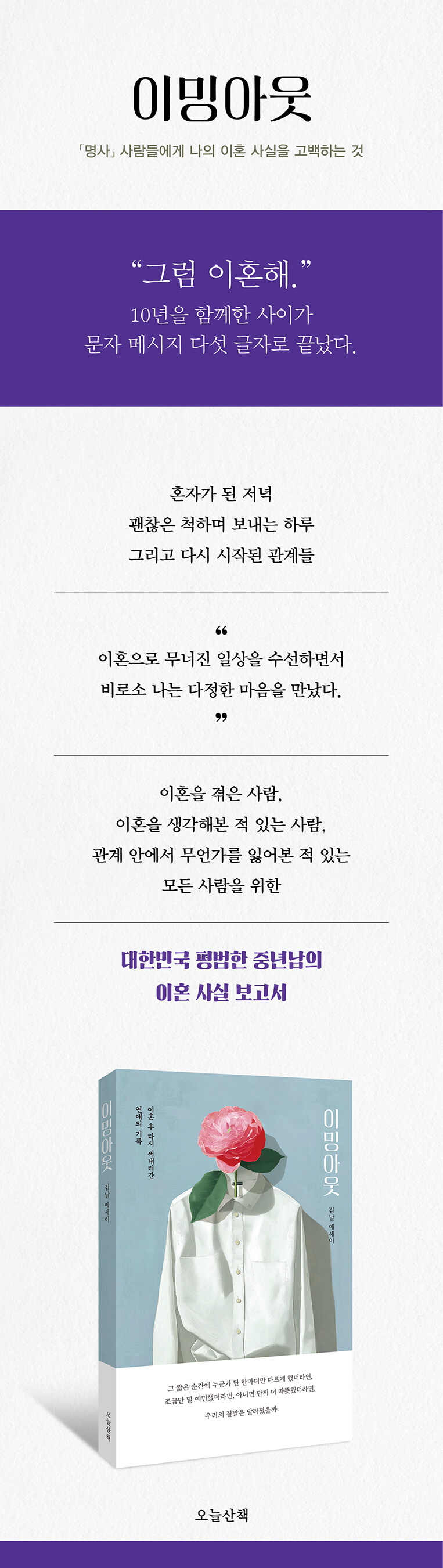 ÀúÀÚ´Â ÀÌÈ¥À̶ó´Â »ç°ÇÀ» Á߽ɿ¡ µÎ°í ÀÚ½ÅÀÌ »ì¾Æ¿Â ½Ã°£ Àüü¸¦ ½ºÄÉÄ¡ÇÑ´Ù. °íµîÇб³ ½ÃÀý ±³È¸¿¡¼ ¸¸³µ´ø ù»ç¶û, ´ëÇп¡¼ 8³âÀ» »ç±Ï ¿¬ÀÎ, ÀÎõ ¼úÁý¿¡¼ ¿ì¿¬È÷ ½ÃÀÛµÈ Àο¬, º´¿ª Ư·Ê ½ÃÀý ¾Ë°Ô µÈ µ¿¼º¾ÖÀÚ Ä£±¸±îÁö. °¢°¢ÀÇ À̾߱â´Â ÀúÀÚ°¡ ¾î¶² ¹æ½ÄÀ¸·Î »ç¶÷À» »ç¶ûÇØ¿Ô´ÂÁö, ¾î¶»°Ô Àΰ£°ü°è¸¦ ¸Î¾úÀ¸¸ç, ¾îµð¼ »óó¸¦ ¹Þ°í ¾îµð¼ Àڽŵµ ¸ð¸£°Ô ¸¶À½ÀÌ ±»¾îÁ³´ÂÁö¸¦ ¿³º¸°Ô ÇÑ´Ù. ÀÌ ¿¡ÇǼҵåµéÀº À¯¸Ó¿Í Ȳ´çÇÔÀ» ǰ°í ÀÖÁö¸¸ ÀÐ°í ³ª¸é ¹¦ÇÏ°Ô ¸¶À½ÀÌ ¿ï··ÀδÙ. ¿ì¸® ¸ðµÎÀÇ ÀλýÀÌ ²À ±×·¨±â ¶§¹®Àϱî.