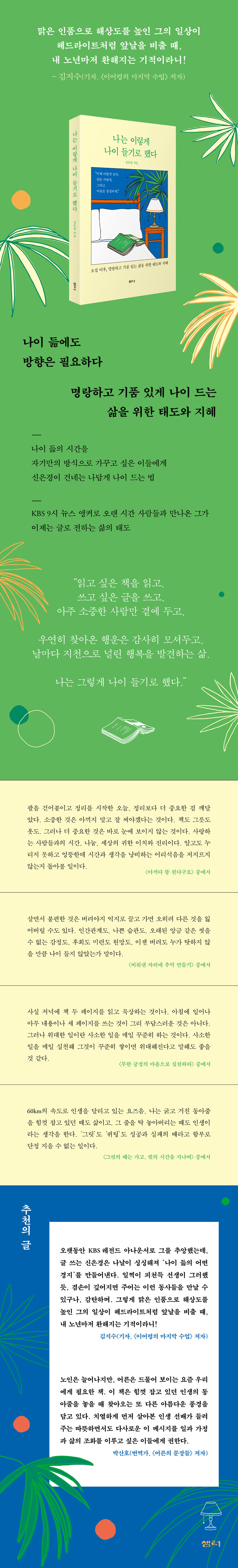 »ùÅͻ翡¼ ½ÅÀº°æ ÀÛ°¡ÀÇ ¿¡¼¼ÀÌ ¡º³ª´Â ÀÌ·¸°Ô ³ªÀÌ µé±â·Î Çß´Ù¡»°¡ Ãâ°£µÆ´Ù. ÀÌ Ã¥Àº 70´ë¿¡ Á¢¾îµé±â¸¦ ¾ÕµÐ ÇÑ »ç¶÷ÀÌ »ýÀ» Áö³ª¸ç ±æ¾î ¿Ã¸° »îÀÇ Åµµ¸¦ ´ã¾Æ³½ ¿¡¼¼ÀÌÀÌ´Ù. ¾Æ³ª¿î¼ÀÌÀÚ ±³¼ö·Î¼ ´Ù¾çÇÑ »ç¶÷µé°ú ¸»°ú ±Û·Î ¸¸³ª¿Â ÀúÀÚ´Â ±× ½Ã°£ ¼Ó¿¡¼ ¼¼»óÀ» ¹Ù¶óº¸´Â ¸¼Àº ½Ã¼±À» ±æ·¯¿Ô´Ù. À̹ø Ã¥¿¡´Â Á߳⿡¼ ³ë³âÀ¸·Î »îÀÌ ÀüȯµÇ´Â ½Ã±â¿¡ ´Þ¶óÁö´Â ¸ö°ú ¸¶À½, »ýȰ°ú »ý°¢ÀÇ º¯È¸¦ Â÷ºÐÈ÷ µé¿©´Ùº»´Ù. ±× ¾È¿¡´Â °è¼ÓÇØ¼ ¸í¶ûÇÔ°ú ¼ºÀåÀÇ ÀÇÁö¸¦ ÀÒÁö ¾Ê°í »ì¾Æ°¡·Á´Â »îÀÇ Åµµ°¡ °í½º¶õÈ÷ ´ã°Ü ÀÖ´Ù.