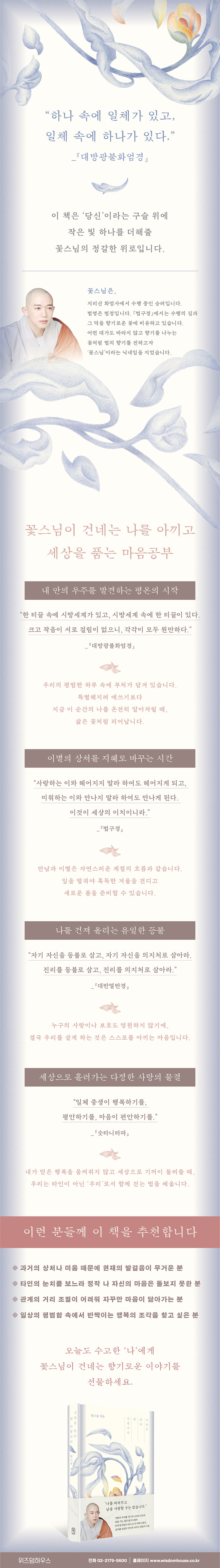 ÀÌ Ã¥Àº Á¾±³Àû °¡¸£Ä§¸¸À» ÀüÇÏ´Â ¹ý¹®ÁýÀÌ ¾Æ´Ï´Ù. ¿´Ù¼¸ ¾î¸° ³ªÀÌ¿¡ ¿¹°í ¾øÀÌ ¸¶ÁÖÇÑ À̺°ÀÇ »óó¸¦ ¾î¶»°Ô »îÀÇ µ¿·ÂÀ¸·Î ¹Ù²Ù¾ú´ÂÁö, ¼Ò¶õ½º·¯¿î ¼¼»ó ¼Ó¿¡¼ ¾î¶»°Ô Àڱ⸸ÀÇ °íÀ¯ÇÑ »ö±òÀ» ÁöŰ¸ç »ì ¼ö ÀÖ´ÂÁö¿¡ ´ëÇÑ ½ÇõÀûÀÎ ÁöÇý¸¦ ´ã°í ÀÖ´Ù. ÀúÀÚ´Â ¡®Àεå¶ó¸Á(ì×öíÔþØÑ)¡¯À̶ó´Â ºÒ±³Àû ¼¼°è°üÀ» ÅëÇØ ¿ì¸®°¡ ¼·ÎÀÇ »îÀ» ºñÃß´Â ±¸½½°ú °°Àº Á¸ÀçÀÓÀ» Àϱú¿öÁØ´Ù. ÇÏÁö¸¸ ±× ¿¬°áÀÇ ÀüÁ¦ Á¶°ÇÀº ¡®³ª¡¯¶ó´Â ±¸½½ÀÌ ¸ÕÀú Åõ¸íÇÏ°í ´Ü´ÜÇÏ°Ô ¼ ÀÖ¾î¾ß ÇÑ´Ù´Â °ÍÀÌ´Ù. ŸÀÎÀÇ ½Ã¼±À̳ª ¹«·ÊÇÑ ºñ³¿¡ ÈֵѸ®Áö ¾Ê°í, ÀÚ½ÅÀÇ ¸¶À½À» º¸»ìÇÇ´Â ¡®°Ç°ÇÑ ÀÚ±âÁ߽ɼº¡¯À» °¡Áú ¶§ ºñ·Î¼Ò ŸÀΰúÀÇ °ü°èµµ ¿ø¸¸ÇØÁú ¼ö ÀÖ´Ù°í À̾߱âÇÑ´Ù.