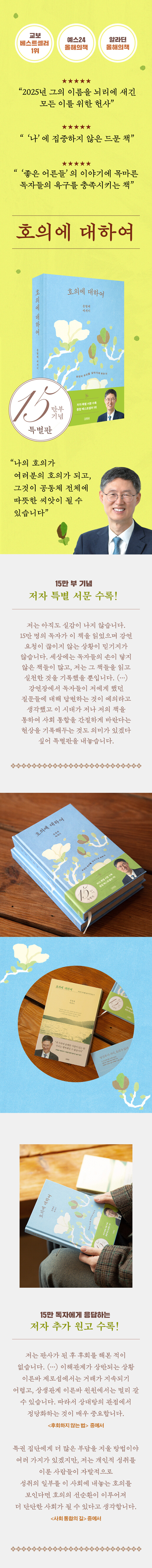 ³ªÀÇ ÀÏ»óÀ» dz¿ä·Ó°Ô ä¿ì´Â °Ç ¾î¶² ÀǹÌÀΰ¡, ¿ì¸®´Â ŸÀÎÀÇ »îÀ» ¿ÂÀüÈ÷ ÀÌÇØÇÒ ¼ö Àִ°¡, »ç¶÷°ú »çȸ´Â ¹Ù²ð ¼ö Àִ°¡. ±×¸®°í, È£ÀÇ´Â »ç¶÷À» ¼¼»óÀ» ¾î¶»°Ô ¹Ù²Ù´Â°¡. ¡°¾Æ¸§´Ù¿î »ç¶÷ÀÌ ¸¹´Ù. Àý¸ÁÇϱ⿣ ¾ÆÁ÷ À̸£´Ù.¡± 30³â °¡±îÀÌ ºÎ´ÜÈ÷ °øºÎÇÏ°í ¼ºÂûÇÑ ½Ã°£ ¼Ó¿¡¼ ±×°¡ ¹ß°ßÇÑ ´Ü¾î´Â ¡®È£ÀÇ¡¯¿´´Ù. ÀÌ Ã¥Àº ¡°Æò±ÕÀÎÀÇ »î¿¡¼ ¹þ¾î³ªÁö ¾Ê°íÀÚ ¾Ö½è´ø ¾î´À ÆÇ»çÀÇ ±â·Ï¡±ÀÌÀÚ ¾Æ¸§´ä°í Æò¹üÇÑ »ç¶÷À» ÇâÇØ ±×°¡ °É¾î°£ ÇàÀûÀÌ´Ù. ¶ÇÇÑ ÀçÆÇ°üÀÌ ¾Æ´Ñ ¡°µ¿½Ã´ë¸¦ »ì¾Æ°¡´Â ´ëÇѱ¹¹ÎÀ¸·Î¼¡± ÇÏ´Â °í¹ÎÀÌÀÚ Á¶±Ý ´õ ³ªÀº »çȸÀÇ ¸ð½ÀÀ» ±â´ëÇÏ¸ç ¼ºÂûÇÑ ±â·ÏÀÌ´Ù.