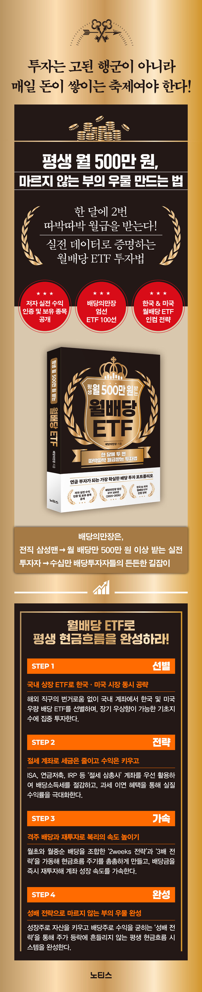 ÀÌ Ã¥Àº ¿ø·ÐÀûÀÎ À̾߱⸦ ³Ñ¾î ±¹³» Áõ½Ã¿¡ »óÀåµÈ Çѱ¹ ¹× ¹Ì±¹ ¹è´ç ETF¸¦ Çö¹Ì°æÃ³·³ ½ÉÃþ ºÐ¼®ÇÑ´Ù. ƯÈ÷ ÇØ¿Ü Á÷±¸ÀÇ ¹ø°Å·Î¿ò ¾øÀÌ ±¹³» °èÁ¿¡¼ ¼öÀÍÀ» ±Ø´ëÈÇÏ´Â ¹ý¿¡ ÁýÁßÇÑ´Ù. ¿©±â¼ ÇÙ½ÉÀº ISA, ¿¬±ÝÀúÃà, IRP·Î À̾îÁö´Â ¡®Àý¼¼ »ïÃѻ硯ÀÇ È°¿ëÀÌ´Ù. ÀúÀÚ´Â ¹è´ç¼Òµæ¼¼¿Í ±ÝÀ¶¼ÒµæÁ¾ÇÕ°ú¼¼¸¦ ÇÇÇÏ¸é¼ ¼öÀÍÀ» °í½º¶õÈ÷ ÀçÅõÀÚÇÒ ¼ö ÀÖ´Â Àý¼¼ °èÁ ¿î¿ë ³ëÇϿ츦 »ó¼¼È÷ °¡À̵åÇÑ´Ù. ¶ÇÇÑ ÃÖ½ÅÀÇ ½ÃÀå µ¥ÀÌÅ͸¦ ¹ÙÅÁÀ¸·Î ¾ö¼±ÇÑ ¡®ÇÙ½É ETF 100¼±¡¯°ú ½ÇÁ¦ ÀúÀÚ º¸À¯ Á¾¸ñ ¸®½ºÆ®´Â µ¶Àڵ鿡°Ô Áï°¢ÀûÀÎ ½ÇÀü ÇØ´äÀ» Á¦½ÃÇÑ´Ù.
