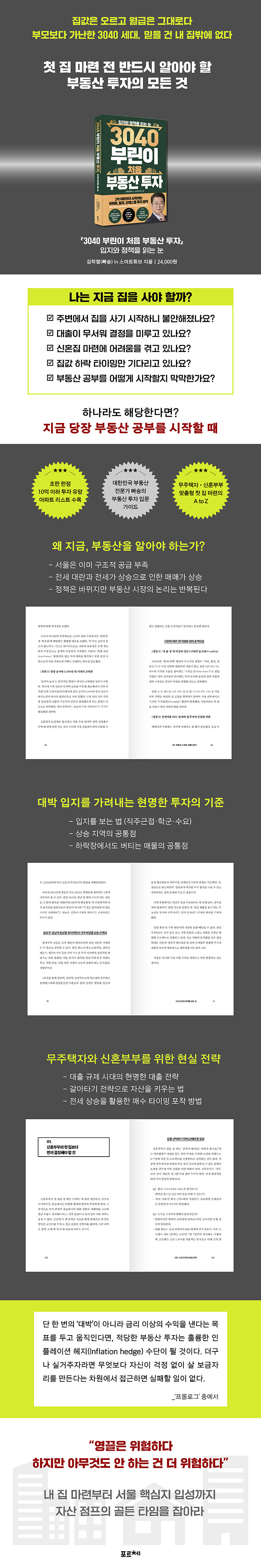 ÀÌ Ã¥Àº ºÎµ¿»ê °øºÎ¸¦ óÀ½ ½ÃÀÛÇÏ´Â 'ºÎ¸°ÀÌ'ºÎÅÍ »ó±ÞÁö °¥¾ÆÅ¸±â¸¦ °í¹ÎÇÏ´Â 1ÁÖÅÃÀÚ±îÁö, ´ëÇѹα¹ ±¹¹ÎÀ̶ó¸é ¹Ýµå½Ã Àоî¾ß ÇÒ Çʵ¶¼·Î ±âȹµÇ¾ú´Ù. ¡°¾îµð°¡ ÁÁÀ»±î¿ä?¡±¶ó°í ¹¯´Â Ãʺ¸ ÅõÀÚÀÚ¿¡°Ô ÀÌ Ã¥Àº ±Ùº»ÀûÀÎ ´äÀ» Á¦½ÃÇØ ºÎµ¿»ê °øºÎÀÇ Ã¹ ´ÜÃ߸¦ Á¦´ë·Î ³¢¿ì°Ô µ½´Â´Ù. 15³â ÀÌ»ó ÀÔÁö¸¦ ºÐ¼®ÇØ ¿Â ´ëÇѹα¹ ÃÖ°íÀÇ ºÎµ¿»ê Àü¹®°¡ÀÎ ÀúÀÚ°¡ ½×¾Æ¿Â µ¥ÀÌÅÍ¿Í ÀÓ»óÀû ÅëÂûÀ» ÅëÇØ ½ÃÀåÀÇ º»ÁúÀ» ²ç¶Õ´Â ¾È¸ñÀ» Ű¿ï ¼ö ÀÖ´Ù. ¹«ÁÖÅÃÀÚ¿¡°Ô ºÎµ¿»êÀº ´Ü¼øÈ÷ ¡®»ç´Â(Buy) °Í¡¯ÀÌ ¾Æ´Ï¶ó ¡®»ç´Â(Live) °÷¡¯ÀÌ´Ù. ÀÎÇ÷¹À̼ÇÀ¸·ÎºÎÅÍ ³» °¡Á·À» ÁöŰ´Â °¡Àå °·ÂÇÑ ¹æ¾î¸·À̱⵵ ÇÏ´Ù. ÀÌ Ã¥Àº ´ç½ÅÀÌ ½ÃÀåÀÇ ¼ÒÀ½¿¡ ÈֵѸ®Áö ¾Ê°í ³» Áý ¸¶·ÃÀÇ °ñµç ŸÀÓÀ» ½º½º·Î °áÁ¤ÇÒ ¼ö ÀÖ°Ô ¸¸µå´Â °·ÂÇÑ ¹«±â°¡ µÉ °ÍÀÌ´Ù.