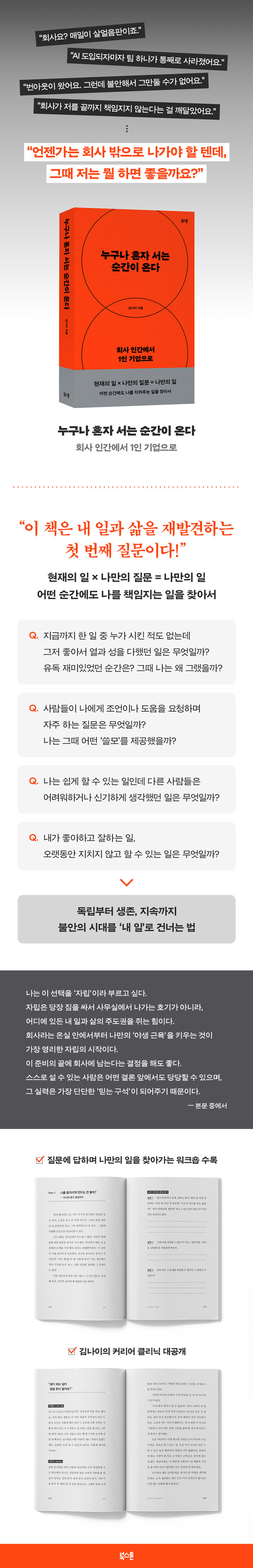 ºÒ¾ÈÀÇ ½Ã´ë¸¦ Áø´ÜÇÏ´Â °ÍÀ» ½ÃÀÛÀ¸·Î µ¶¸³ÀÇ Á¶°Ç, »ýÁ¸ÀÇ ±â¼ú, Èçµé¸² ¾øÀÌ ÀÏÀ» Áö¼ÓÇÏ´Â ¸¶À½°¡Áü±îÁö ³ª¸¸ÀÇ °íÀ¯ÇÑ ºñÁî´Ï½º¸¦ ¸¸µé¾î³»´Â °úÁ¤À» µû¶ó°¡´Ù º¸¸é ³ª¶ó´Â Á¸Àç°¡ Á¡Â÷ ¼±¸íÇØÁö´Â °æÇèÀ» ÇÏ°Ô µÈ´Ù. ºÎ·ÏÀ¸·Î ¼ö·ÏµÈ ¡®³ª¸¸ÀÇ ÀÏ Ã£±â ¿öÅ©¼ó¡¯°ú ¡®±è³ªÀÌÀÇ Ä¿¸®¾î Ŭ¸®´Ð¡¯µµ Á÷Á¢ ³» ÀÏÀ» ±×·Áº¼ ¼ö ÀÖ´Â ½ÇÀü µµ±¸´Ù.