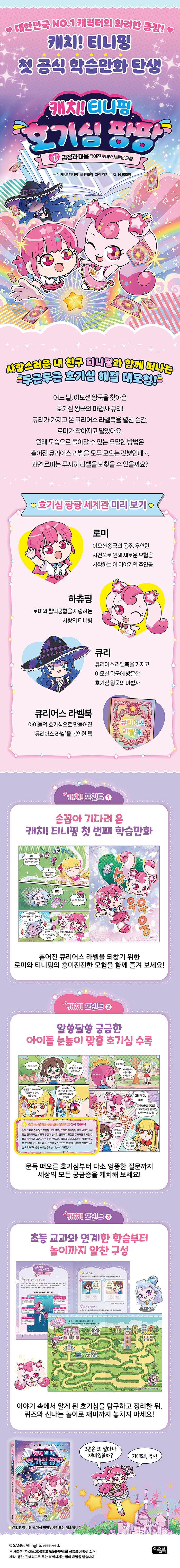 ¡¶Ä³Ä¡! Ƽ´ÏÇΠȣ±â½É ÆÎÆÎ¡·Àº ±âÁ¸ ÆÒµé¿¡°Ô´Â Ä£¼÷ÇÑ À̸ð¼Ç ¿Õ±¹ÀÇ ¸Å·ÂÀº À¯ÁöÇϸé¼, ÇнÀ¸¸È¸¦ À§ÇØ »õ·Ó°Ô ¼³°èµÈ ¡®È£±â½É ¿Õ±¹¡¯À̶ó´Â µ¶ÀÚÀûÀÎ ¼¼°è°üÀ» ´õÇØ ÇÑÃþ È®ÀåµÈ ¸ðÇèÀ» ¼±º¸ÀÔ´Ï´Ù. ÀÌ ³î¶ó¿î À̾߱â´Â È£±â½É ¿Õ±¹ÀÇ ½Åºñ·Î¿î ¸¶¹ý»ç Å¥¸®°¡ À̸ð¼Ç ¿Õ±¹¿¡ ¹æ¹®ÇÏ¸é¼ ½ÃÀ۵˴ϴÙ. Å¥¸®°¡ °¡Á®¿Â Å¥¸®¾î½º ¶óº§ÀÌ ¿ì¿¬ÇÑ »ç°ÇÀ¸·Î ÀÎÇØ Èð¾îÁö°í, ±× ¿µÇâÀ¸·Î ÁÖÀΰø ·Î¹Ì°¡ ÀÛ¾ÆÁö°Ô µË´Ï´Ù. ·Î¹Ì´Â ¿ø·¡ ¸ð½ÀÀ» µÇã±â À§ÇØ Æ¼´ÏÇΰú ÇÔ²² Èð¾îÁø Å¥¸®¾î½º ¶óº§À» µÇã±â À§ÇÑ »õ·Î¿î ¸ðÇèÀ» ½ÃÀÛÇÕ´Ï´Ù. <ijġ! Ƽ´ÏÇÎ> ƯÀ¯ÀÇ »ç¶û½º·¯¿î ij¸¯ÅÍ ¸Å·ÂÀº »ì¸®¸é¼, È£±â½ÉÀ» ÇØ°áÇÏ¸ç ¶óº§À» ¸ð¾Æ °¡´Â Äù½ºÆ®Çü ½ºÅ丮 ±¸Á¶¸¦ µµÀÔÇØ ÇнÀ°ú ¸ðÇèÀÌ ÀÚ¿¬½º·´°Ô °áÇÕÇÏ´Â À̾߱⸦ ¿Ï¼ºÇß½À´Ï´Ù. ¾öÁö °øÁÖ°¡ µÈ ·Î¹Ì¿Í Ƽ´ÏÇÎ, ±×¸®°í »õ·Î¿î ij¸¯Å͵éÀÌ ÇÔ²² ÆîÄ¡´Â Èï¹ÌÁøÁøÇÑ ¸ðÇèÀº ¾ÆÀ̵éÀÇ »ó»ó·ÂÀ» ÀÚ±ØÇϸç À̾߱⠼ÓÀ¸·Î À̲ø °ÍÀÔ´Ï´Ù.