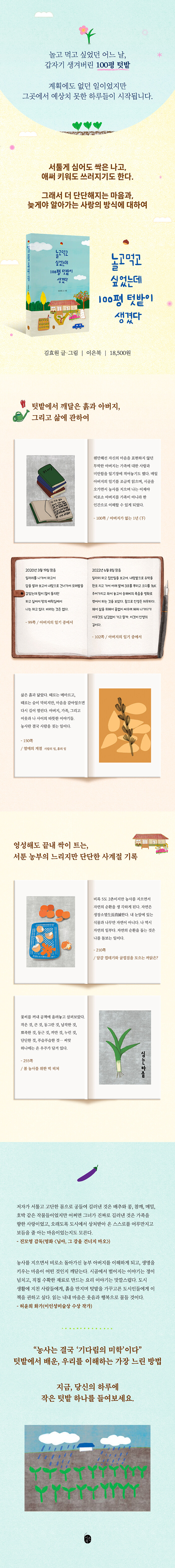 ÅԹ翡¼ÀÇ ½Ã°£Àº Á¡Á¡ »îÀ» ¹Ù¶óº¸´Â ½Ã¼±À» ¹Ù²ã³õ´Â´Ù. ºñ°¡ ¿ÀÁö ¾Ê¾Æµµ °ÆÁ¤À̰í, ³Ê¹« ¸¹ÀÌ ¿Íµµ ¹®Á¦ÀÎ ÀÚ¿¬ ¾Õ¿¡¼ Àΰ£Àº ´Ã °â¼ÕÇØÁú ¼ö¹Û¿¡ ¾ø´Ù. ¾Ö½á Ű¿î ÀÛ¹°Àº ½±°Ô ¹«³ÊÁöÁö¸¸, ½ÉÁö ¾ÊÀº ÀâÃÊ´Â ´©±¸º¸´Ùµµ Àß ÀÚ¶ó´Â ¾ÆÀÌ·¯´Ï ¼Ó¿¡¼ ÀúÀÚ´Â ÀÚ¿¬ÀÇ Áú¼¿Í »îÀÇ ±ÕÇüÀ» ¹è¿î´Ù. ³ó»ç¸¦ Áþ±â Àü¿¡´Â ´ç¿¬ÇÏ°Ô ¿©°å´ø ä¼Ò¿Í °úÀÏ Çϳª¿¡µµ ¼ö¸¹Àº ¼Õ±æÀÌ ´ê¾Æ ÀÖ´Ù´Â °ÍÀ» ¾Ë°Ô µÇ°í, ´©±º°¡ÀÇ ¼ö°í¸¦ ½±°Ô ¸»ÇÏÁö ¸øÇÏ°Ô µÈ´Ù. Á÷Á¢ ÈëÀ» ¸¸Áö°í, ¶¡À» È긮°í, ±â´Ù¸®´Â ½Ã°£À» Áö³ª¸ç ºñ·Î¼Ò ¡®Å°¿î´Ù¡¯´Â °ÍÀÇ Àǹ̸¦ ÀÌÇØÇÏ°Ô µÈ´Ù.