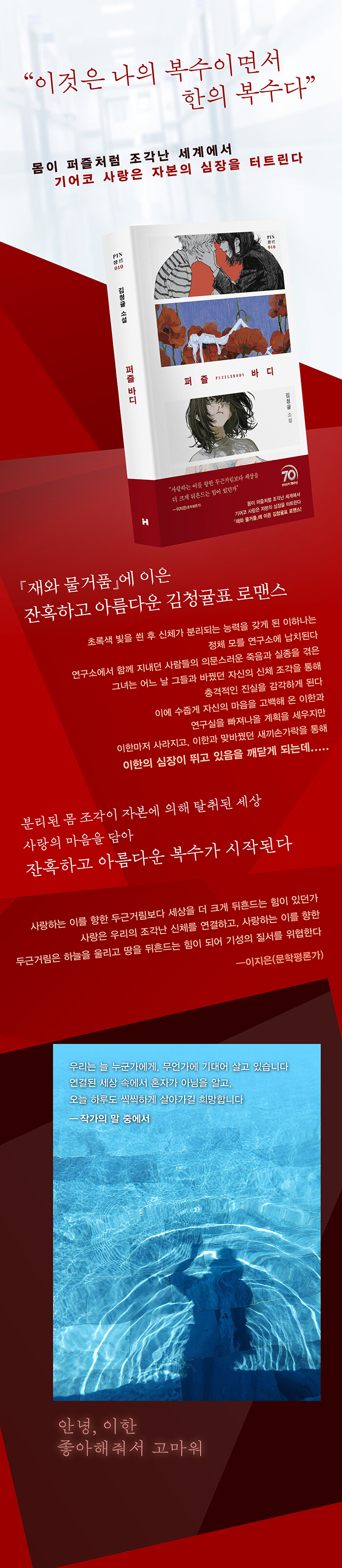 ÆÇŸÁö·Î¸Ç½ºÀÇ ¿ÜÇǸ¦ µÎ¸£°í ¼Ò¼öÀÚ¿Í ¾àÀÚÀÇ ¸ñ¼Ò¸®¸¦ ¼¶¼¼È÷ µé·ÁÁØ ¡ºÀç¿Í ¹°°Åǰ¡»À¸·Î ¹µ µ¶ÀÚµéÀÇ ¸¶À½À» »ç·ÎÀâÀ¸¸ç ÀÚ½ÅÀÇ À̸§À» °¢ÀÎÇÑ ÀÛ°¡, ±èû±ÖÀº ±×°£ ¡°°øÁ¸°ú Çù·Â¡±(õ¼±¶õ)¿¡ ÁÖ¸ñÇÏ¸ç ¡°»óó¿Í »ó»óÀÌ ÃàÁ¶Çس½¡±(¹Î°¡°æ) ¼¼°è ¼Ó ¡°ºñź¿¡ Àá±â´Â ´ë½Å ÁøÈÇϰí, ÆÄ±«µÇÁö ¾Ê±â À§ÇØ ÆÄ±«ÇÒ ¼ö¹Û¿¡ ¾ø´Â¡±(À̼¼ö) ¿©¼º»óÀ» ³»¼¼¿ì¸é¼µµ ¡°¸¶À½²¯ ¼Ó¾ÆÁÖ°í ½ÍÀº »ç¶û½º·¯¿ò¡±(Á¶¿¹Àº)ÀÌ ÀÖ´Â ¼Ò¼³À» ¾´´Ù´Â ÆòÀ» ¹Þ¾Æ¿Ô´Ù. À̹ø ½ÅÀÛ ¡ºÆÛÁñ ¹Ùµð¡»´Â ¡ºÀç¿Í ¹°°Åǰ¡»¿¡ ÀÌ¾î ¡®±èû±ÖÇ¥ ·Î¸Ç½º¡¯¸¦ ÅåÅåÈ÷ º¸¿©ÁÖ´Â ÀÛǰÀ¸·Î¼, ¸öÀÌ ºÐ¸®µÈ´Ù´Â ¼³Á¤ÀÇ SF ¼¼°è°ü ¾Æ·¡, ³²µé°ú ¾îµò°¡ ´Ù¸£°í Á¶±ÝÀº ¡°ÀÌ»óÇÑ¡± ÀÚ½ÅÀ» ÀÖ´Â ±×´ë·Î ¹Þ¾Æµé¿©ÁØ ¡®³ª¡¯(ÀÌÇϳª)¸¦ ÇâÇÑ ¡®ÀÌÇÑ¡¯ÀÇ ¼ÖÁ÷ÇÏ°íµµ Áø½ÇµÈ ¸¶À½°ú, À̵éÀÇ ¸öÀ» µµ±¸ »ï¾Æ ÀÌ¿ëÇÏ·Á´Â °Å´ë ÀÚº»¿¡ ¡®³ª¡¯°¡ º¸³»´Â º¹¼ö±ØÀ» ±×¸°´Ù. ¡°¿ë±â¿Í Áø½ÉÀ» ´ã¾Æ ³ª¸¦ ÁÁ¾ÆÇÑ´Ù ¸¶À½À» ÀüÇß´ø¡± ³Ê¸¦ À§ÇÑ ÀÌ º¹¼ö±ØÀº ±×°£ ±èû±ÖÇ¥ ·Î¸Ç½º¸¦ ±â´Ù·Á¿Â µ¶ÀÚµéÀÇ ±â´ë¸¦ ÃæÁ·Çϱ⿡ ÃæºÐÇÒ °ÍÀÌ´Ù.