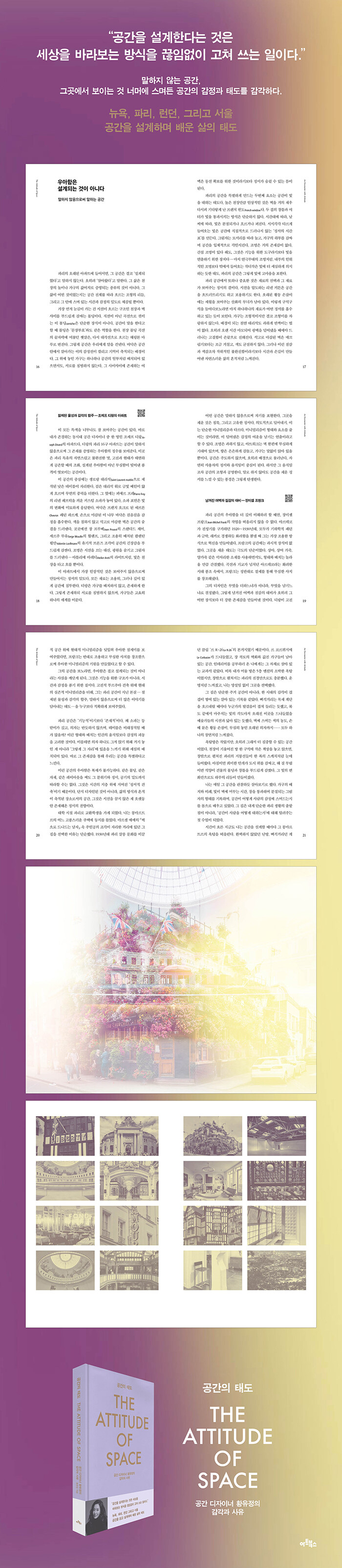 °ø°£ µðÀÚÀ̳ÊÀÌÀÚ ºê·£µå ¾ÆÆ® & µðÀÚÀÎ ÃѰý µð·ºÅÍÀΠȲÀ¯Á¤ÀÌ Áö³ 20¿© ³â°£ ´º¿å, ÆÄ¸®, ·±´ø, ¼¿ïÀ̶ó´Â ¼·Î ´Ù¸¥ ³× µµ½Ã¸¦ Ⱦ´ÜÇϸç üµæÇÑ °¨°¢À» ¹ÙÅÁÀ¸·Î, µðÀÚÀΠöÇаú »çÀ¯¸¦ ´ã¾Æ Æì³½ ¡º°ø°£ÀÇ Åµµ¡»´Â Á¦¸ñ¿¡¼ µå·¯³ªµí °ø°£À» ¡®ÇüÅ¡¯°¡ ¾Æ´Ñ ¡®Åµµ¡¯·Î Àо´Â Ã¥ÀÌ´Ù. ÀÌ Ã¥Àº °ø°£À» ´Ü¼øÇÑ ¹°¸®Àû ȯ°æÀ̳ª ½Ã°¢Àû °á°ú¹°·Î ÀÌÇØÇÏ´Â µ¥¼ ÇÑ °ÉÀ½ ´õ ³ª¾Æ°¡, °ø°£ÀÌ Àΰ£À» ¾î¶»°Ô ¸ÂÀÌÇϰí, ¾î¶»°Ô ¸Ó¹°°Ô Çϸç, ³¡³» ¾î¶² °¨Á¤°ú »îÀÇ °áÀ» ºú¾î³»´ÂÁö¸¦ Á¶¿ëÈ÷ µÇ¤´Â´Ù. ÀúÀÚ´Â ¹®ÈÀû ¹è°æÀÌ ¼·Î ´Ù¸¥ µµ½Ãµé¿¡¼ »ýȰÇÏ°í °æÇèÇÑ °ø°£ÀÇ ´ëÇÑ ±â¾ïÀ» ºñ·ÔÇØ ±×°÷ÀÌ Àΰ£ÀÇ ³»¸é¿¡ ½º¸çµå´Â ¹æ½ÄÀ» ¼¶¼¼ÇÏ°Ô Æ÷ÂøÇϸç, ±â´É°ú È¿À² Áß½ÉÀÇ µðÀÚÀÎÀ» ³Ñ¾î ¡®°¨Á¤ÀÇ ±¸Á¶¡¯·Î¼ °ø°£À» »çÀ¯ÇÏ´Â »õ·Î¿î ½Ã¼±À» ¿ì¸® ¾Õ¿¡ ³»¾î³õ´Â´Ù.