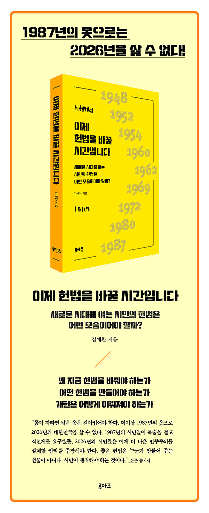 ÁöÀºÀÌ´Â »õ·Î¿î Çå¹ýÀÌ ´õÀÌ»ó Á¤Ä¡Àε鸸ÀÇ Çù»ó °á°ú¹°ÀÌ µÇ¾î¼´Â ¾È µÈ´Ù°í ÁöÀûÇÑ´Ù. Çå¹ýÀº ¿ì¸®°¡ ¾î¶² »çȸ¸¦ ¸¸µé °ÍÀÎÁö¿¡ ´ëÇÑ °øµ¿ÀÇ ¾à¼ÓÀ̱⿡, Áö±Ý ¿ì¸®ÀÇ Çö½Ç¿¡ ¸Â´Â Çå¹ýÀ» ÁÖ±ÇÀÚÀÎ ½Ã¹ÎÀÇ ÁÖµµ·Î »õ·Ó°Ô ½á¾ß ÇÑ´Ù°í °Á¶ÇÑ´Ù. ÀÌ´Â ´Ü¼øÇÑ Á¦µµ °³ÆíÀ» ³Ñ¾î, ¹ÎÁÖÁÖÀÇÀÇ ÁÖü¸¦ ´Ù½Ã ¼¼¿ì´Â °úÁ¤À̱⵵ ÇÏ´Ù.