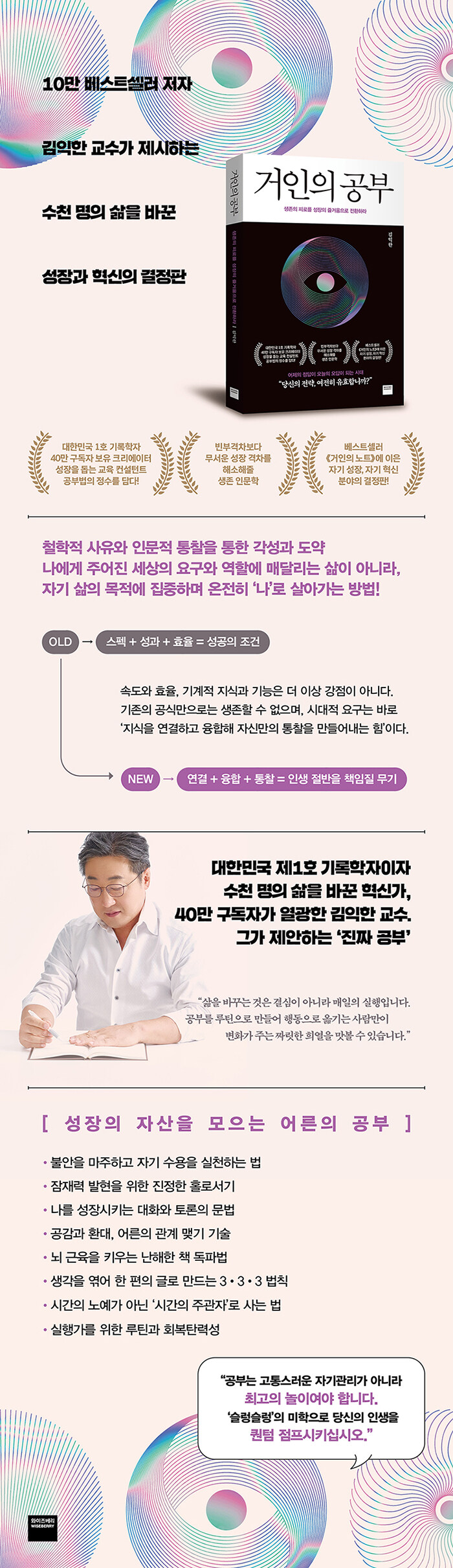 2021³â ¸» ½ÃÀÛµÈ ¿Â¶óÀÎ ¼ºÀå Ä¿¹Â´ÏƼ ¡®¾ÆÀÌĵ´ëÇС¯¿¡´Â Áö³ 4³â¿© µ¿¾È 6,000¸í ÀÌ»óÀÌ Âü¿©ÇØ °øºÎÇß°í, ±×Áß 1,700¿© ¸íÀÌ ³¡±îÁö °úÁ¤À» ¿ÏÁÖÇß´Ù. ƯÈ÷ 30¸í ÀÌ»óÀÌ ÀÚ½ÅÀÇ À̸§À¸·Î Ã¥À» Ãâ°£ÇÏ¸ç ½ÇÁ¦ »îÀÇ º¯È¸¦ Áõ¸íÇß´Ù´Â Á¡Àº ÀÌ Ä¿¹Â´ÏƼ°¡ ´Ü¼øÇÑ ÇнÀ °ø°£À» ³Ñ¾î »îÀÇ ¹æÇâÀ» ¹Ù²Ù´Â ÀåÀ̾ú´Ù´Â »ç½ÇÀ» º¸¿©ÁØ´Ù. ¡¶°ÅÀÎÀÇ °øºÎ¡·´Â ¹Ù·Î ±× Ä¡¿ÇÑ ÇöÀå¿¡¼ ÃàÀûµÈ ¹è¿ò°ú ¼ºÀå, ±×¸®°í »ç¶÷µé »çÀÌÀÇ ¿¬´ë°¡ ÀÀÃàµÈ °á°ú¹°ÀÌ´Ù. ÀúÀÚ´Â 30ºÐÀ» Èǽ ³Ñ´Â °ÀÇ 60°³¿Í ¿©´ü ±ÇÀÇ Çʵ¶¼, »ý°¢·Â¡¤¿¬±¸·Â¡¤½ÇÇà·Â¡¤°ü°è·Â¡¤ÇâÀ¯·ÂÀ¸·Î À̾îÁö´Â ¹æ´ëÇÑ Ä¿¸®Å§·³ °¡¿îµ¥ »îÀ» º¯È½ÃŰ´Â µ¥ ²À ÇÊ¿äÇÑ Çٽɸ¸À» ¼±º°ÇØ ÇÑ ±Ç¿¡ ´ã¾Ò´Ù°í ¸»ÇÑ´Ù.