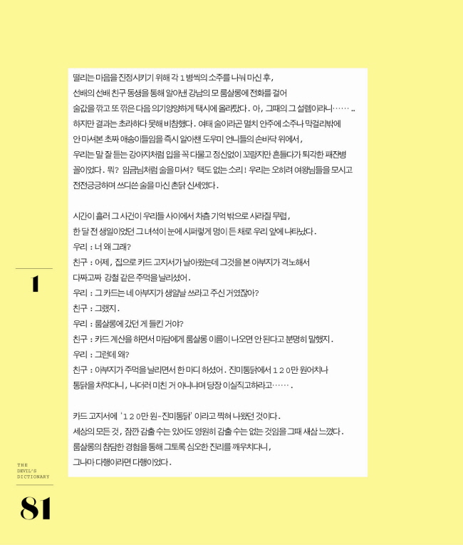 1969³â»ýÀ¸·Î ´Ü±¹´ëÇб³ ½Ã°¢µðÀÚÀΰú¸¦ Á¹¾÷Çß´Ù. 3³â ¹Ý µ¿¾È 'Á¶¼±ÀϺ¸'¿¡ ¿¬ÀçÇÑ °ÍÀ» Ã¥À¸·Î ¹Àº ¡º±¤¼ö»ý°¢¡»À¸·Î 250¸¸ µ¶ÀÚÀÇ ¸¶À½À» »ç·ÎÀâÀ¸¸ç º£½ºÆ®¼¿·¯ ÀÛ°¡°¡ µÇ¾ú´Ù. Àú¼·Î´Â ¡º±¤¼ö»ý°¢¡» ¿Ü¿¡µµ ¡º±¤¼ö ±¤¼ö¾¾ ±¤¼ö³ð¡» µîÀÇ ¸¸ÈÃ¥°ú ¡º±×¶§ ³ª¸¦ Åë°úÇÏ´Â ¹Ù¶÷ÀÌ ³»°Ô ¹°¾ú´Ù. ¾ÆÁ÷µµ ±×¸³´Ï?¡», ¡º¹«Áö°³¸¦ ÁÀ´Ù, ¼¼»ó ¾Æ¸§´Ù¿î dz°æµéÀ» Áö³ªÄ¡´Ù.¡», '»îµµ »ç¶ûµµ Âü ¼Å÷ »ç¶÷µé'¿¡°Ô º¸³»´Â °¡½¿ µû¶æÇÑ ÀÀ¿ø°¡ÀÎ ¡ºÂü ¼Å÷ »ç¶÷µé¡», ÀÚ½ÅÀÇ ½ÇÆÐ¸¦ ¼ÖÁ÷È÷ µå·¯³»¸é¼ »î°ú Á×À½, Çູ¿¡ ´ëÇÑ ´Ü»óÀ» ´ãÀº ¡ºÇØÇÇ¿£µù¡», ¡º³ª»Û ±¤¼ö»ý°¢¡»,¡º¾î¼¸é, ¾î¼¸é, ¾î¼¸é¡» µîÀÇ ¿¡¼¼À̸¦ ÅëÇØ Èñ¸Á°ú ÇູÀÇ »îÀ» ±×·Á³»°í ÀÖ´Ù.
