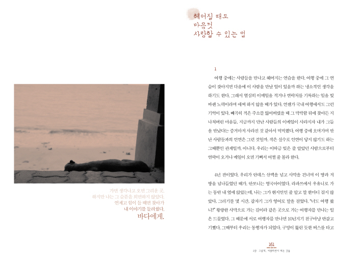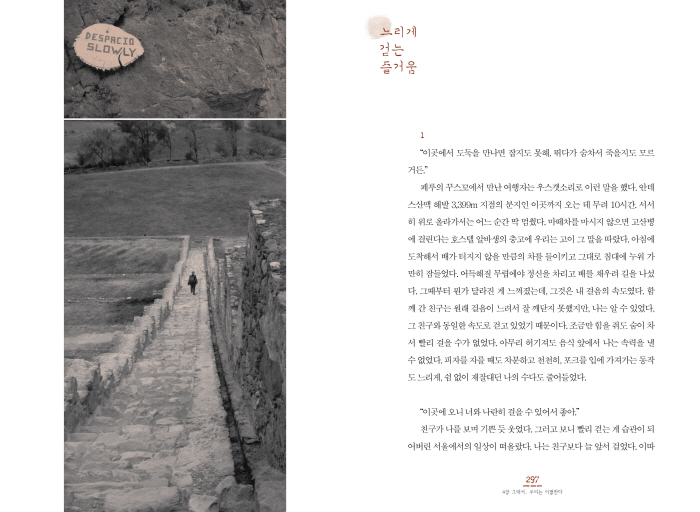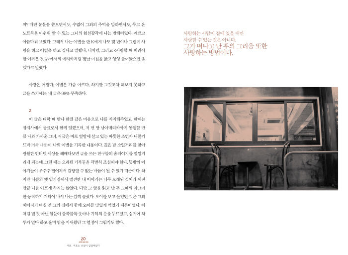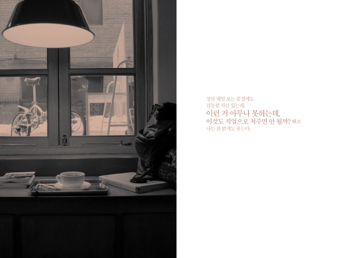 ÀÌÁ¦ ¼¸¥ÀÇ ¹®ÅÎÀ» ³Ñ±ä ¾î¸¥¾ÆÀÌ. ÀâÁö»ç¿¡¼ 3³â ³Ñ°Ô ÀÏÇÏ´Ù°¡ ¿ì¿¬È÷ ij³ª´Ù·Î, ij³ª´Ù¿¡¼ ³²¾Æ¸Þ¸®Ä«·Î ¿©ÇàÇÔ. ¸Å ¼ø°£ °¨µ¿Çϸç, ¸ÅÀÏÀ» ÃàÁ¦Ã³·³ »ì±â À§ÇØ ÀÚ½ÅÀÌ ÇÏ´Â ÀÏÀ» ÃãÃßµí ÇÏ°í ½ÍÁö¸¸, ¹ÚÀÚ °¨°¢ÀÌ ¾ø¾î¼ ¿ì¼± ÃãÀ» ¹è¿öº¼±î »ý°¢ Áß. ¼¼»ó ¸ðµç ¾Æ¸§´Ù¿î °ÍµéÀ» º¸°í ´ã°í ´À³¢´Â ÀÏÀ» °ÔÀ»¸® ÇÏÁö ¾ÊÀ¸¸ç, ¿©ÇàÀÇ ¹¦¹Ì°¡ »ç¶÷ ¸¸³ª´Â ÀÏÀ̶ó »ý°¢ÇÏ¿© È¥ÀÚ ÀÚÁÖ ¶°³ª¸ç, ¹é¼öÀÏ ¶§ µ·µµ ¾øÀÌ ÀϺ», Àεµ, ¸ù°ñ, Çʸ®ÇÉ µîÀ» ¿©ÇàÇÏ´Â ÀçÁÖ¸¦ ¼±º¸ÀÓ. ÀÌ ¸ðµç ±â¾ïÀ» Àß ´Ùµë¾î ¿¬ÇÊ·Î ²Ú²Ú ´·¯ ±â·ÏÇÏ´Â ÀÏÀÌ Ãë¹ÌÀÌÀÚ Æ¯±âÀ̰í ÀÌÁ¦´Â Á÷¾÷ÀÌ µÇ¾úÀ½. °°Àº ½Ã°£¿¡ Ãâ±ÙÇÏ°í ¸ÅÀÏ ´Ù¸¥ ½Ã°£¿¡ Åð±ÙÇØ¾ß Çϴ ȸ»ç¸¦ ±×¸¸µÐ ÈÄ °©ÀÚ±â ã¾Æ¿Â µÎ·Á¿ò¿¡ 1³â°£ ÀÇ ±è¾¾(Á¤·Á¿ø)ó·³ µ¿±¼ °°Àº ¹æ¿¡¼ »ì±âµµ ÇßÁö¸¸, ³¡±îÁö ¹Ï¾îÁØ Ä£±¸¿Í ºÎ¸ð´Ô ´öºÐ¿¡ ´Ù½Ã ±âÀÚ¿Í ¸®Æ÷ÅͷΠȰµ¿ ½ÃÀÛ. ¿ù°£ ¿¡ 8³â° ¡®ÆäÆäÀÇ Çʸ§Å롯À» ¿¬ÀçÇÏ¸ç °¡²û ¹æÈ²ÇÏ´Â ±âÀÚµéÀÇ ´ëŸ·Î ÀÎÅÍºä ±â»ç¸¦ ¾¸. °í¸¶¿î ºÐÀÇ µµ¿òÀ¸·Î Áö±ÝÀº ¿ÍÀÌÁê Ä¿¹Â´ÏÄÉÀ̼ǿ¡¼ ¹®È¿Í °ü·ÃÇÑ ÀÛ°¡·Î Ȱµ¿ÇÔ. ½¬´Â ³¯¿¡´Â µ¿³×¸¦ »êÃ¥ÇÏ¸ç ¹é¼öÀΠô À¯À¯ÀÚÀûÀÌÁö¸¸, À̵û±Ý ´ÙÀ½ ´Þ¿¡´Â ¾î¶»°Ô »ì¾Æ°¥Áö¿¡ ´ëÇÑ °í¹ÎÀ» Çϱ⵵ ÇÔ. ³·°í °¡³ÇÑ ¶¥À» ¿©ÇàÇÏ¸ç »ç´Â »îÀ» ²Þ²Ù¸ç ÀÏ»óÁ¶Â÷ ±æ À§ÀÇ »ç¶÷ó·³ »ì°í ÀÖ´Â ±×³à¸¦ µÎ°í Ä£±¸µéÀº È÷ÇÇ, Áý½Ã, º¸Çì¹Ì¾È, ½ÉÁö¾î Ȩ¸®½º¶ó°í ºÎ¸£Áö¸¸, ±×³à´Â ÀÚ½ÅÀ» ¡®»î ¿¬±¸°¡¡¯¶ó°í ¼Ò°³ÇÔ. ¹äº¸´Ù ¹®È¸¦ ÁÁ¾ÆÇϰí, »ç¶÷µé°ú ³ª´©±â À§ÇØ ¿µÈ, Ã¥, À½¾Ç, ¿¬±Ø µîµîÀÇ ¹®È ¸®ºä¸¦ ¿¬ÀçÇÏ¸ç ¹Ì´ÏȨÇÇ¿¡´Â ¼¼»ó ¸ðµç À½¾ÇÀ» ºÐÀ§±âº°·Î ¼±°îÇØ¼ ¿Ã·Á³õ´Â °Ô Ãë¹ÌÀÓ. Ãâ°£ÇÑ Ã¥À¸·Î´Â ¿µÈ¿¡¼¼ÀÌÁý ÀÌ ÀÖ´Ù.