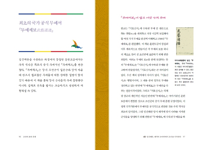 Çѱ³´Â ¡º±âÈ¿½Å¼¡»¿¡ ¼ö·ÏµÈ ¹«¿¹ Áß ¸Ç¼ÕÀ¸·Î ÇÏ´Â ±Ç¹ýÀ» Á¦¿ÜÇÏ°í °¡Àå ½Ã±ÞÈ÷ µµÀÔÇØ¾ß ÇÒ ¿©¼¸ °¡Áö ¹«¿¹¸¦ ¿ÏÀüÈ÷ ÀÌÇØÇϰí 1598³â ¡º¹«¿¹Á¦º¸¡»¸¦ ÆíÂùÇß´Ù. ÀÌ Ã¥Àº ÈÆ·Ãµµ°¨ÀÌ Ã¢¼³µÈ ÀÌÈÄ °è¼ÓÀûÀ¸·Î ¸¸µé¾îÁø °¢ ¹«¿¹ÀÇ º¸¸¦ ÇϳªÀÇ Ã¥À¸·Î ¹¾î Àü Á¶¼±±º¿¡ º¸±ÞÇϱâ À§ÇØ ÆíÂùµÇ¾ú´Ù. ¿©·¯ð³ ¹«¿¹ÀÇ º¸Üϸ¦ Çѵ¥ ¹¾ú´Ù´Â ¶æÀÇ ¡º¹«¿¹Á¦º¸¡»´Â ¡º±âÈ¿½Å¼¡»¿¡ ¼ö·ÏµÈ ¹«¿¹¸¦ Âü°íÇÏ¿© ¸¸µé¾úÁö¸¸, ¡º±âÈ¿½Å¼¡»¿Í´Â Å« Â÷ÀÌÁ¡ÀÌ ÀÖ´Ù. ¿ì¼± Ã¥ÀÇ ¼º°Ý¿¡¼ Â÷À̰¡ ÀÖ´Ù. ¡º±âÈ¿½Å¼¡»´Â º´¹ý¼À̸ç, ±× ³»¿ë ÁßÀÇ ÀϺηΠ¹«¿¹¸¦ Á¤¸®Çϰí ÀÖ´Â ¹Ý¸é¿¡ ¡º¹«¿¹Á¦º¸¡»´Â ±¹°¡±â°üÀÎ ÈÆ·Ãµµ°¨¿¡¼ ÆíÂùÇÑ °ÍÀ¸·Î Á¶¼±±ºÀÇ °ø½Ä ¹«¿¹ ÈÆ·Ã ±ÔÁ¤À̾ú´Ù. ÀÌ·¸°Ô ±¹°¡±â°ü¿¡¼ ¹«¿¹¼¸¦ °ø½ÄÀûÀ¸·Î ÆíÂùÇÑ °ÍÀº ¿ì¸® ¿ª»ç»ó ÃÖÃÊÀÇ ÀÏÀ̾ú´Ù.
