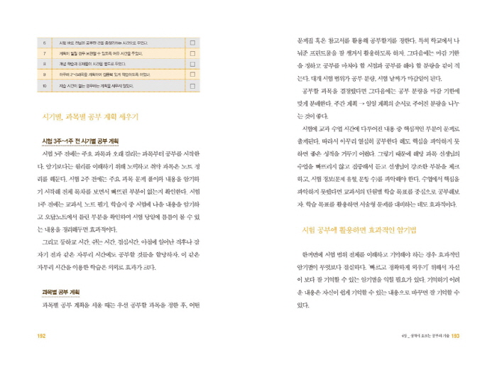 ¸¹Àº ÇлýµéÀÌ ½Çõ °¡´ÉÇÑ °èȹÀ» ¼¼¿ì´Â ¹æ¹ýÀ» ¸ô¶ó °èȹÀ» ¼¼¿ì´Â °Í¿¡ ´ëÇØ ºÎ´ã°¨À» °®°í ÀÖ´Ù. ¡°°øºÎ °èȹÀ» ¼¼¿ö 6°³¿ù Á¤µµ °øºÎÇØºÃ´Âµ¥, Àß ÁöŰÁö ¸øÇÏ´Ï±î ³ªÁß¿¡´Â ¾Æ¿¹ °èȹÀ» ¼¼¿ìÁö ¾Ê°Ô µÇ¾ú¾î¿ä.¡± ÁÁÀº ¼ºÀûÀ» °ÅµÎ±â À§Çؼ´Â ¡®½Çõ °¡´ÉÇÑ ½ÃÇè °èȹǥ¡¯¸¦ ¼¼¿ì´Â °ÍºÎÅÍ ½ÃÀÛÇÏÀÚ. °ÅâÇÑ ½ÃÇè °èȹǥ¸¦ Â¥µµ ½ÇõÇÏÁö ¾ÊÀ¸¸é ¹«¿ëÁö¹°ÀÌ´Ù. ½ÃÇè 3ÁÖ Àü, 2ÁÖ Àü, 1ÁÖ Àü¿¡ ¹Ýµå½Ã ÇØ¾ß ÇÏ´Â °ÍµéÀ» üũ¸®½ºÆ®·Î ¸¸µé¾î °øºÎ ½Çõ Á¤µµ¸¦ Áö¼ÓÀûÀ¸·Î Á¡°ËÇÏÀÚ. ½ÇõÇÑ ÈÄ Ã¼Å©ÇÏ´Â Ç׸ñÀÌ ´Ã¾î³¯¼ö·Ï °øºÎ¹ý¿¡ ´ëÇÑ ¼º°ø °æÇèÀÌ ½×ÀÌ¸é¼ Àڽۨµµ ³ôÀÏ ¼ö ÀÖ´Ù. ½ÃÇè ½Ã±âº°·Î ÀÚ½ÅÀÇ ½Çõ »óȲÀ» Á¡°ËÇÏ°í ½ÇõÇÏÁö ¸øÇÑ ºÎºÐ¿¡ ´ëÇØ º¸¿ÏÇϵµ·Ï ÇÏÀÚ. _ 160~162ÆäÀÌÁö
