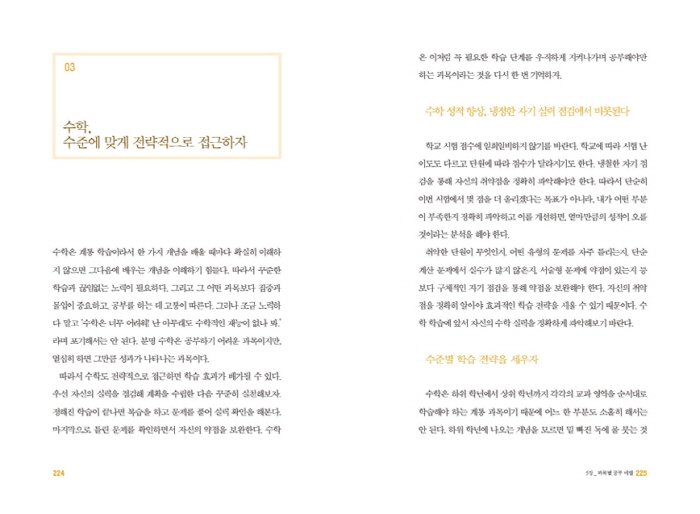 ¼ö¹Ú¾¾´åÄÄÀº Áö³ 5³â°£ °Ô½ÃÆÇ ¹× ´ãÀÓ ¼±»ý´ÔÀÇ »ó´ãÀüȸ¦ Ȱ¿ëÇØ ÇÏÀ§±Ç ÇлýºÎÅÍ ÃÖ»óÀ§±Ç Çлý±îÁö ´Ù¾çÇÑ ÇлýµéÀ» ´ë»óÀ¸·Î ÇнÀ »ó´ã°ú ÄÚĪÀ» ÁøÇàÇß´Ù. À̶§ Áø´Ü °Ë»ç, ÇнÀ ÇàÅ ¹× ÇнÀ È¿À²¼º °Ë»çµµ º´ÇàÇß´Ù. ±× °á°ú, °øºÎ¸¦ ÀßÇÏ´Â Çлýµé¿¡°Ô´Â ´ÙÀ½ ´Ù¼¸ °¡ÁöÀÇ °øÅëÁ¡ÀÌ ¹ß°ßµÇ¾ú´Ù. ¡®°øºÎ ¸ñÇ¥¿Í °èȹÀ» ¼¼¿î´Ù, ¸ð¸£´Â °ÍÀº È¥ÀÚ¼ ¾Ë ¶§±îÁö ¹°°í ´Ã¾îÁø´Ù, ÁýÁß·ÂÀ» ³ôÀ̱â À§ÇØ ²÷ÀÓ¾øÀÌ ³ë·ÂÇÑ´Ù, ÀÚ½ÅÀ» ¹Ý¼ºÇÏ°í µ¹¾Æº»´Ù, ÇÊ¿äÇÑ ÇнÀ µµ±¸´Â ½º½º·Î ¼±ÅÃÇÑ´Ù.¡¯ ÀÌ ´Ù¼¸ °¡Áö °øºÎ ¹ýÄ¢À» ÀÌ¹Ì ¾Ë°í ÀÖ´Â Çлýµµ ÀÖÀ» °ÍÀ̰í, ºÎ¸ð´Ô¿¡°Ô¼ ±Í¿¡ ¸øÀÌ ¹ÚÈ÷µµ·Ï µé¾ú´ø Çлýµµ ÀÖÀ» °ÍÀÌ´Ù. ÀÌ ´Ù¼¸ °¡Áö´Â ºÐ¸í ½ÇõÇϱ⠽±Áö ¾ÊÀº °ÍµéÀÌÁö¸¸, À̸¦ ´Ü¼øÈ÷ ¾Ë°í¸¸ ÀÖ´Â Çлý°ú ½ÇõÇÏ´Â ÇлýÀÇ Â÷ÀÌ´Â ¾öû³ª´Ù. - 103ÆäÀÌÁö