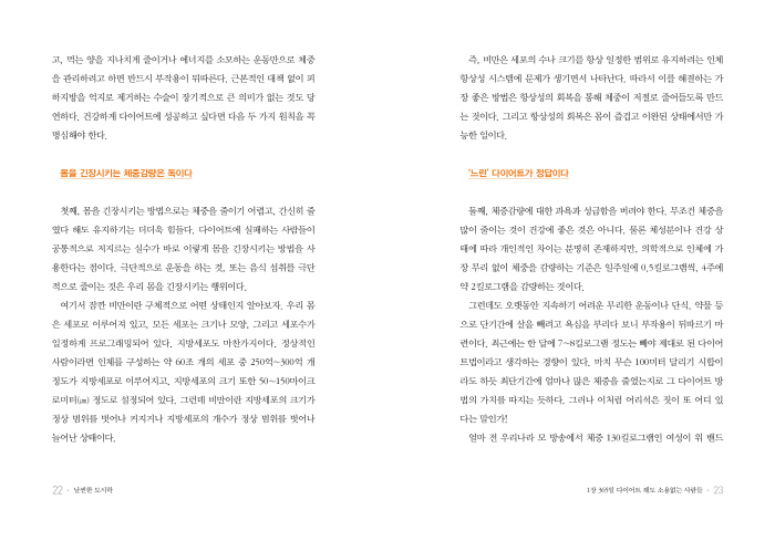 ÀÌ Ã¥Àº ¾î¶»°Ô ¿¡³ÊÁö ´ë»çÀ²À» ³ôÀ̰í, Æò»ý ¿ä¿ä Çö»ó ¾øÀÌ °¡Àå ÀÌ»óÀûÀΠüÁßÀ» À¯ÁöÇÒ ¼ö ÀÖ´ÂÁö ¼³¸íÇϰí ÀÖ´Ù. ¾Æ¿ï·¯ SBSÇ÷¯½º ä³Î¿¡¼ ¹æ¼ÛµÇ´Â <³¯¾ÀÇÑ µµ½Ã¶ô>ÀÇ ¿ä¸® ·¹½ÃÇÇ 6°¡Áö¿Í Áý¿¡¼ ½±°Ô µû¶óÇÒ ¼ö ÀÖ´Â ¿îµ¿¹ýµéÀ» ¼Ò°³ÇÑ´Ù.