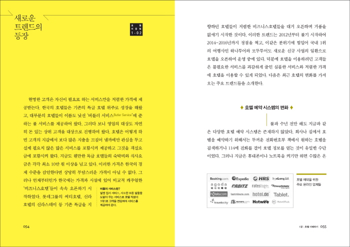°ú°Å¿¡ ºñÇØ È£ÅÚ ÀÌ¿ëÀÌ ±Þ°ÝÈ÷ ´Ã¾î³ª´Â ¿äÁò. È£ÅÚÀ» ÀÌ¿ëÇÏ´Â ¸¸ÅÀ̳ª ÀϹÝÀεéÀº È£ÅÚ°ú È£ÅÚ¸®¾î¿¡ ´ëÇÑ Á¤º¸¸¦ ¾ó¸¶³ª ¾Ë°í ÀÖÀ»±î? ÀÌ Ã¥Àº 20³â º£Å×¶ûÀÇ ÇöÁ÷ È£ÅÚ¸®¾î°¡ È£ÅÚ¿¡ ±Ù¹«Çϴ ȣÅÚ¸®¾îÁ¶Â÷µµ Àß ¸ð¸£°í Àְųª °í°´À¸·Î¼ ³õÄ¡Áö ¸»¾Æ¾ß ÇÒ È£ÅÚ ÀÌ¿ë »ó½Ä 101°¡Áö¸¦ ¾Ë±â ½±°Ô ¼Ò°³ÇÏ¿´´Ù. ¸ÕÀú °í°´ÀÇ ´ÏÁî¿¡ ¸Â°Ô º¯ÈÇϰí Àִ ȣÅÚ Æ®·»µå Áß ¾Æ³¯·Î±×¿¡¼ µðÁöÅнôë·Î º¯ÈÇØ°¡´Â ¿¹¾à½Ã½ºÅÛ°ú È£ÅÚ ¹æ¹®°´ÀÇ º¯È, È£ÅÚ ¼º¼ö±âÀÇ º¯È µîÀ» ¾Ë·ÁÁÖ¸ç ¼¼ºÎÀûÀ¸·Î °´½Ç°ú ·¹½ºÅä¶û µî ºÎ´ë½Ã¼³Àº ¹°·Ð, È£ÅÚ¿¡¼ Á¦°øÇÏ´Â ´Ù¾çÇÑ ¼ºñ½ºµéÀ» ¾È³»Çϰí ÀÖ´Ù. ¶ÇÇÑ ÀϹÝÀÎÀ̳ª ºñÁî´Ï½º °í°´µéÀÌ È£ÅÚÀ» ÀÌ¿ëÇÔ¿¡ ÀÖ¾î¼ ¾Ë¾ÆµÎ¾î¾ß ÇÒ »çÇ×°ú ±Ã±ÝÇØÇß´ø »çÇ×µé±îÁöµµ »ó¼¼È÷ üũÇÏ¿© ¾Ë·ÁÁÖ°í ÀÖ´Ù.