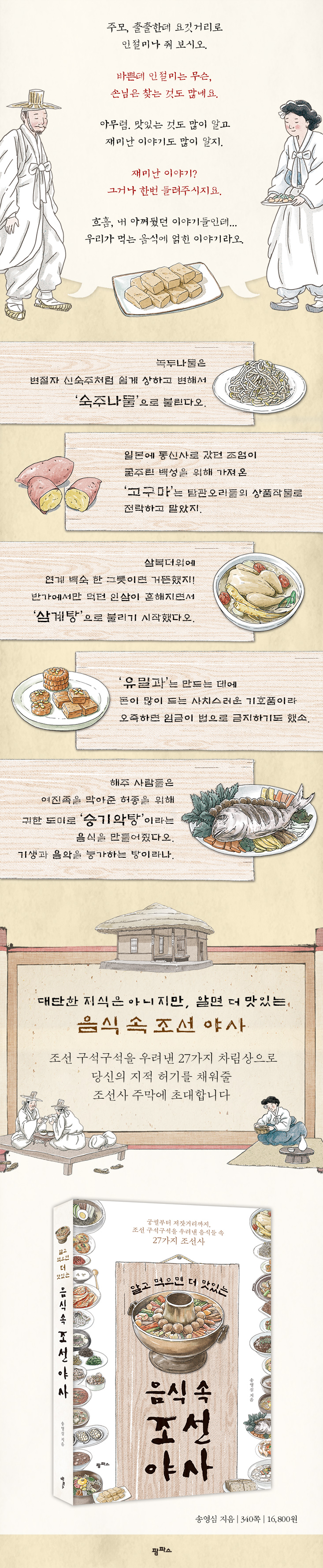 ÀÌ Ã¥Àº ±× À̾߱âµé Áß¿¡¼µµ À½½Ä°ú °ü·ÃÇØ¼ ¿ª»çÃ¥¿£ ¾ø´Â ³»¿ëÀÌÁö¸¸ Á¶¼±ÀÇ ³»¸éÀ» ±í¼÷ÀÌ µé¿©´Ù º¼ ¼ö ÀÖ´Â ¾ß»ç¸¦ Ç®¾î³Â´Ù. ¾ß»çÁö¸¸ ´Ü¼øÈ÷ Èï¹Ì À§ÁÖÀÇ ³»¿ëÀÌ ¾Æ´Ñ Á¶¼±ÀÇ Á¤Ä¡»ç¿Í »ýȰ»ç, ½Ã´ë»ó, ÇâÅä»ç, ½ÅºÐ°ú °ü·ÃÇÑ Æø³ÐÀº Áö½ÄµéÀ» ½±°í Àç¹ÌÀÖ°Ô ¼Ò°³ÇÑ´Ù. Á¶¼± »ç¶÷µéÀÇ SNS ¿ªÇÒÀ» Çß´ø ÀúÀã°Å¸®ÀÇ ÁÖ¸·À» ¹è°æÀ¸·Î, ÀÌ Ã¥À» ÆîÄ£ ¸ðµÎ¿¡°Ô ¸ÀÀÖ´Â À½½ÄÀ» ³»¾îÁÖ°í ±×¿¡ ¾ôÈù Á¶¼± ¾ß»ç±îÁö µé·ÁÁØ´Ù. Áö±ÝºÎÅÍ À½½Ä»ç¿Í ´õºÒ¾î Á¶¼±»ç±îÁö ºÎ´ã ¾øÀÌ ¼ÒȽÃų ¼ö Àִ dz¼ºÇÑ Â÷¸²»óÀÌ ÆîÃÄÁø´Ù.