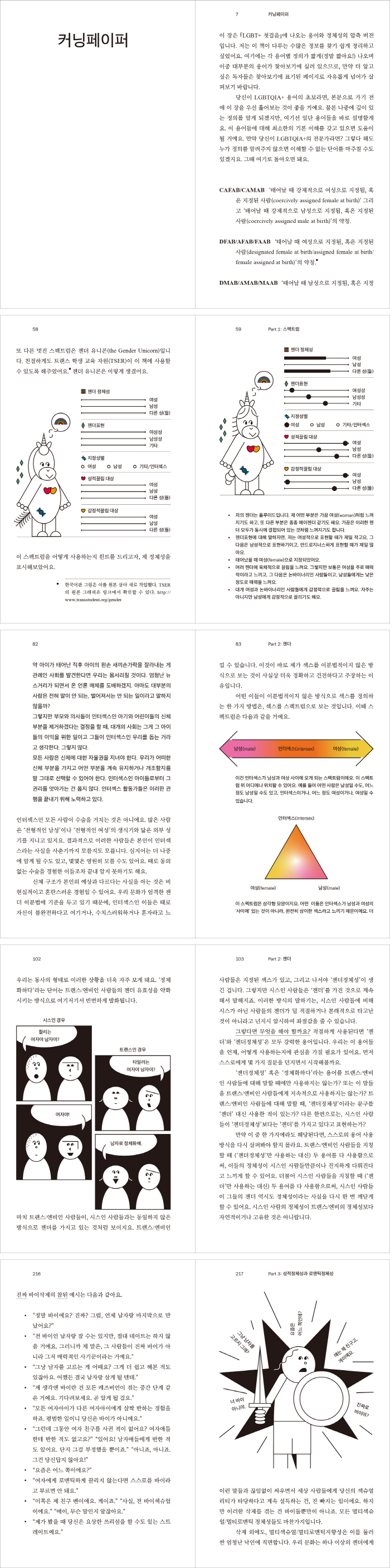 ³²¼º(Man)Àº À̺ÐÀû Á¨´õ¿¡¼ ³²¼º(man)À¸·Î Á¤Ã¼ÈÇÏ´Â »ç¶÷ÀÌ´Ù. ¿©¼ºÀº? ¿©¼º(Woman)À¸ ·Î Á¤Ã¼ÈÇÏ´Â »ç¶÷ÀÌ´Ù. ÇÏÁö¸¸ Á¨´õ´Â ÀÌ µÎ °³°¡ ¾Æ´Ï´Ù. ¿¹ÄÁ´ë ¡®¿¡ÀÌÁ¨´õ¡¯ÀÎ »ç¶÷µéÀº º»Àο¡°Ô Á¨´õ°¡ ¾ø´Ù°í ´À³¤´Ù. ¡®ÀÎÅÍÁ¨´õ¡¯´Â ³²¼º°ú ¿©¼º »çÀÌ ¾îµò°¡¿¡¼ ȤÀº µÎ À̺йýÀû ¼ºÀ» ¼¯¾î¼ Á¤Ã¼ÈÇÏ´Â »ç¶÷ÀÌ´Ù. ¡®Á¨´õ´ºÆ®·²¡¯Àº Á߸³Àû Á¨´õ ȤÀº ƯÁ¤Çϱâ Èûµç Á¨´õ¸¦ Áö´Ñ °ÍÀ» ¸»ÇÑ´Ù. ÀÌ·± ¿ë¾îµéÀÌ Á¸ÀçÇÏ´Â ÀÌÀ¯´Â °£´ÜÇÏ´Ù. ¿©±â¿¡ ÇØ´çÇÏ´Â »ç¶÷µéÀÌ Á¸ÀçÇϱ⠶§¹®ÀÌ´Ù. ¡®¹ÙÀÌÁ¨ ´õ¡¯ ¡®±×·¹ÀÌÁ¨´õ¡¯ ¡®¸Æ½ÃÁ¨´õ¡¯ ¡®Á¨´õ¹«°ü½É¡¯ ¡®Á¨´õÄÁÇ»Àü(Á¨´õÆÜfuck!)¡¯ µîµî, ºñ½ÁÇÑ µíÇϸ鼵µ ¹Ì¼¼ ÇÏÁö¸¸ Áß¿äÇÑ Â÷À̸¦ Áö´Ñ ¸¹Àº Á¨´õ À̸§Ç¥°¡ Á¸ÀçÇÑ´Ù. ¼ºÀû ÁöÇ⼺°ú ²ø¸²ÀÇ Á¾·ùµµ ¸¶Âù°¡Áö´Ù. ¡®¿¡À̼½½´¾ó¡¯ ¡®Á¦µå¼½½´¾ó¡¯ ¡®µ¥¹Ì¼½½´¾ó¡¯ ¡®ÄâÀ̼½½´ ¾ó¡¯ µîµî, ÀÌ·± ¸»µéÀº ¹«¾ùÀ» ÀǹÌÇÒ±î? ¿ì¸® »çȸ¿¡´Â ƯÈ÷ »ý¼ÒÇÑ ¸»ÀÎ ¸¸Å, óÀ½¿¡´Â °ñÄ¡ ¾ÆÇÁ °í È¥¶õ½º·¯¿ö º¸ÀÏ ¼ö ÀÖ´Ù. ÇÏÁö¸¸ ÀÌ ¼ö¸¹Àº ¸»µéÀÌ °í¾ÈµÈ °ÍÀº ±× ¸»·Î¼ ÁöĪÇÒ ´ë»óÀÌ Àֱ⠶§¹®ÀÌ´Ù. ±×¸®°í ¸»ÀÌ »ý°Ü³²À¸·Î½á ±âÁ¸ »çȸÀÇ À̺йýÀû Á¨´õ »ç°í¿¡¼ ¾ï¾ÐµÇ¾ú´ø ¸ð½ÀµéÀº ¸í¸í µÇ°í °¡½ÃÈµÇ°í ¹Þ¾Æµé¿©Áú ¼ö ÀÖ°Ô µÈ´Ù. ÀÌ Ã¥ÀÌ ¼Ò°³ÇÏ´Â LGBTQIA+ ¿ë¾îµéÀº ¿©¼º°ú ³²¼ºÀ̶ó´Â À̺йýÀ¸·Î´Â ´ã¾Æ³»Áö ¸øÇß´ø Á¸Àç ¹æ½Ä, È£¸ð¼½½´¾ó(µ¿¼º¾Ö)°ú ÇìÅ׷μ½½´¾ó(À̼º¾Ö)À̶ó´Â À̺йýÀ¸·Î´Â µå·¯³¾ ¼ö ¾ø´Â »ç¶ûÀÇ ¹æ½Ä À» ÆÄ¾Ç °¡´ÉÇÏ°Ô ¸¸µç´Ù. LGBTQIA+¿¡ ´ëÇÑ Áö½ÄÀº ¿ì¸® ÀڽŰú ´Ù¸¥ »ç¶÷ÀÇ Á¸Àç ¹æ½ÄÀ» ÀÌÇØÇÏ ´Â ½Ã¾ß¸¦ ¹«ÇÑÈ÷ ³ÐÇôÁÙ ¼ö ÀÖ´Ù.