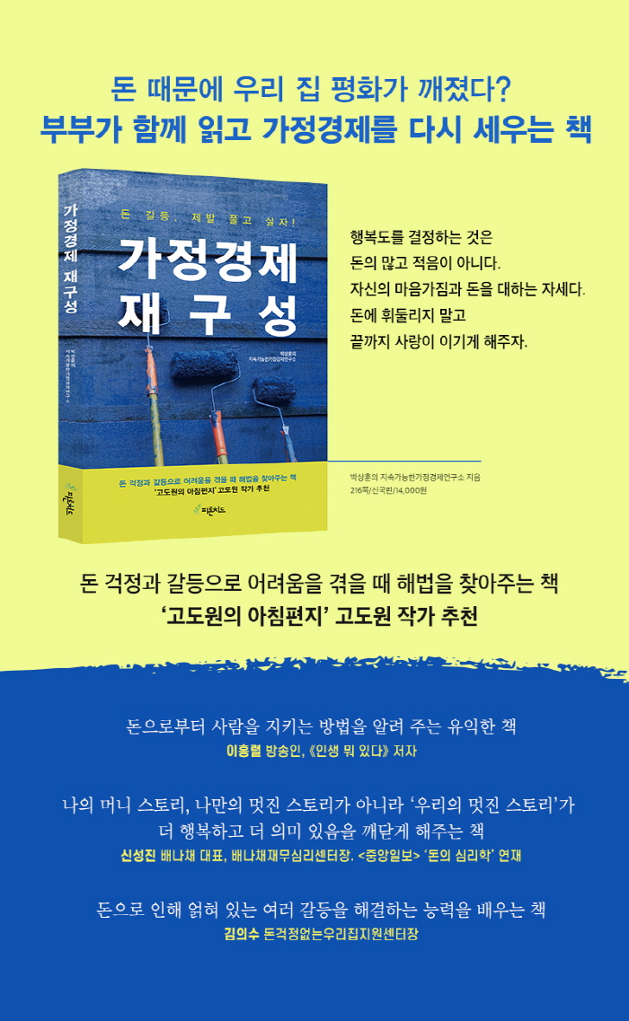 - µ·À¸·Î ÀÎÇØ ¹ß»ýÇÏ´Â ¹®Á¦¸¦ ¹«ÀÛÁ¤ ¡®µ·¡¯ Áß½ÉÀ¸·Î ÇØ°áÇÏ·Á´Ù ´õ Å« ¾î·Á¿ò¿¡ ºÀÂøÇϰí, ½ÉÁö¾î °¡Á¤ ÇØÃ¼ À§±â±îÁö ³»¸ô¸®´Â À繫 »ó´ã »ç·Ê°¡ ¸¹Àº Çö½ÇÀÌ´Ù. Æò¼Ò Å©°í ÀÛÀº µ· °¥µîÀ» ¡®°¡Á· ¿ªÇÒÀÇ À籸¼º¡¯À¸·Î Ǫ´Â ÀçÁ¤ÈÆ·ÃÀÌ ¾ø¾ú±â ¶§¹®ÀÌ´Ù. ¡¶°¡Á¤°æÁ¦ À籸¼º¡·Àº ÀÌ·± Çö½Ç¿¡ Á÷¸éÇϰí, µ· °¥µîÀ» ¡®»ç¶÷¡¯ Áß½ÉÀ¸·Î Ç®¾î°¡¸é¼ °¡Á¤°æÁ¦¸¦ »ì¸®°í, Ä£¹ÐÇÑ °¡Á·°ü°è·Î À̲ø¾îÁÙ ¡®À繫 ´ëȹý¡¯À» Á¦¾ÈÇÑ´Ù.