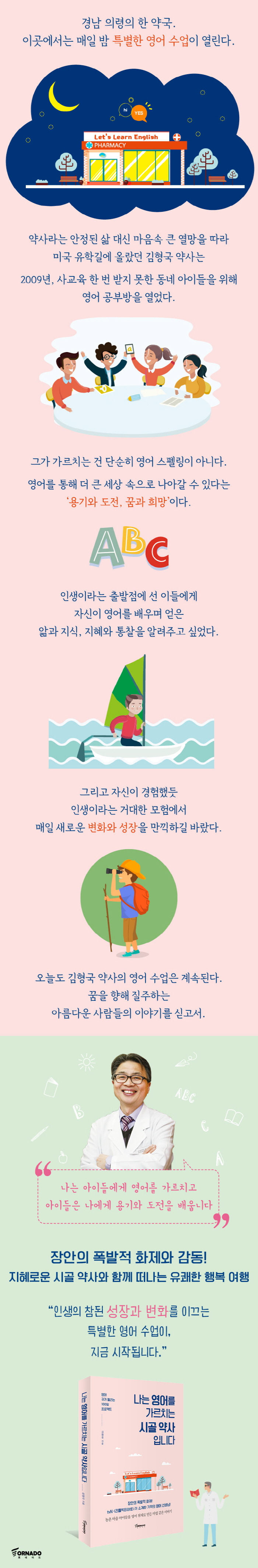 ¾à»ç¶ó´Â Á÷¾÷Àº Çѱ¹ »çȸ¿¡¼ ¾ÈÁ¤À» º¸ÀåÇØÁִ ¡ǥ¿´´Ù. ÇÏÁö¸¸ ±×´Â ³ªÀÌ ¸¶Èç¿¡ ¸¶À½¼Ó ´õ Å« ¼¼°è¸¦ ÇâÇÑ °¥¸ÁÀ» µû¶ó ¹Ì±¹ À¯Çб濡 ¿Ã¶ú´Ù. ±×¸®°í 10³â ÈÄ ´Ù½Ã µ¹¾Æ¿Í ÀÛÀº ½Ã°ñ¿¡ ¾à±¹À» Â÷·È´Ù. ȯÀÚ¸¦ µ¹º¸´Â ¾à»ç·Î ÀþÀº ³¯À» »ì¾Ò°í, ÀÌÁ¦ ¿©»ýÀ» ÇÑÀûÇÑ ³óÃÌ¿¡¼ ÆòÈ·Ó°Ô º¸³»¸é ÃæºÐÈ÷ ¼º°øÇÑ »îÀ» »ê °ÍÀ̾úÀ» ÅÍ¿´´Ù. ÇÏÁö¸¸ ±×´Â µ¹¿¬ ¾à±¹ ¾È¿¡ °øºÎ¹æÀ» ¸¸µé¾ú´Ù. °øºÎ¿¡´Â º° °ü½É ¾ø´ø ¾ÆÀ̵éÀ» ÂÑ¾Æ´Ù´Ï¸ç ²öÁú±â°Ô ¿µ¾î¸¦ ¹è¿ï °ÍÀ» ±ÇÀ¯Çß´Ù. ±×·¸°Ô ÇϳªµÑ ¸¶Áö¸øÇØ Çб³°¡ ³¡³ª¸é ¾à±¹ ¹®À» ¿°í µé¾î¿Ô´ø ¾ÆÀ̵éÀº °ð ±×ÀÇ ¿µ¾î ¼ö¾÷¿¡ Èì»¶ ºüÁ®µé¾ú´Ù. »ç±³À° ÇÑ ¹ø ¹ÞÁö ¸øÇÑ ½Ã°ñ ¾ÆÀ̵éÀÌ °¢Á¾ Àü±¹ ¿µ¾î°æÁø´ëȸ¿¡ ³ª°¡ »óÀ» Ÿ±â ½ÃÀÛÇß´Ù. ¹Ì±¹ À¯ÇÐ »ýȰ 10³âÀ» ÅëÇØ °³¹ßÇÑ ±×ÀÇ ¿µ¾î °øºÎ¹ý°ú ÇÔ²² ¿À¶ÒÀÌ °øºÎ¹æÀº Á¡Á¡ À¯¸íÇØÁö±â ½ÃÀÛÇß°í, ¸¶Ä§³» tvN ¡´¸®Æ²ºòÈ÷¾î·Î¡µ¿¡ ¼Ò°³µÇ¾î Àå¾ÈÀÇ ¶ß°Å¿î ÈÁ¦¸¦ ºÒ·¯ ÀÏÀ¸Ä×´Ù.