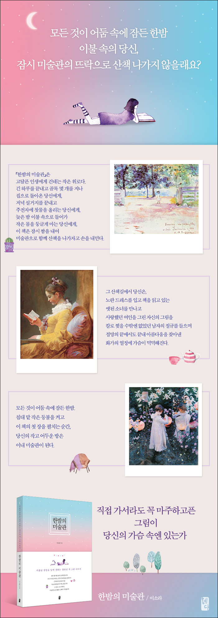 ³ëÁøÈ£ (Áß¾ÓÀϺ¸ ¹®ÈºÎ ±âÀÚ) : ¾î´Àµ¡ ¹Ì¼ú°ü¿¡ °¤Èù ±×¸². ÀÚ¿¬½º·´°Ô »ýȰ°ú ±«¸®µÈ ¹Ì¼ú. °¡²û¾¿ Á¢ÇÏ´Â Æò¸éÀÇ ±×¸²¿¡¼ ¿ì¸®´Â ´ÜÆíÀû °¨»ó ¿Ü¿¡ ¹«¾ùÀ» ´õ Àо¾ß ÇÒ±î. ¡ºÇѹãÀÇ ¹Ì¼ú°ü¡»Àº ÀÌ·± °í¹Î¿¡ ºüÁø ÀÌ¿¡°Ô °áÄÚ ¹«°ÌÁö ¾ÊÀº ¹æ½ÄÀ¸·Î ¿¹¼úÀû È£±â½ÉÀ» ÀÚ±ØÇÑ´Ù. ÀÌ Ã¥¿¡ ¼Ò°³µÈ 15°³ÀÇ À̾߱âµéÀº ±Û¾´À̰¡ ¿¹¼úÀ» ¾î¶»°Ô ÀνÄÇÏ´ÂÁö º¸¿©Áִµ¥, °á±¹ ±× ÀνÄÀÇ ³¡Àº ¿ì¸®ÀÇ »ýȰ¿¡ ¿Í¼ ´ê´Â´Ù. ±×·¸°Ô ¸Þ½ÃÁö´Â ¿©¿îÀ¸·Î ³²´Â´Ù. ÀÌ ±ÛµéÀÌ ±×¸²¿¡ ´ëÇÑ À̾߱âÀÌ¸é¼ ¿ì¸®ÀÇ À̾߱âÀÎ ÀÌÀ¯. °¡º±°Ô Àаí Ã¥À» µ¤´Â´Ù. Á¶±ÝÀº ¹Ì¼úÀÌ ÆíÇØÁø ´À³¦À¸·Î.