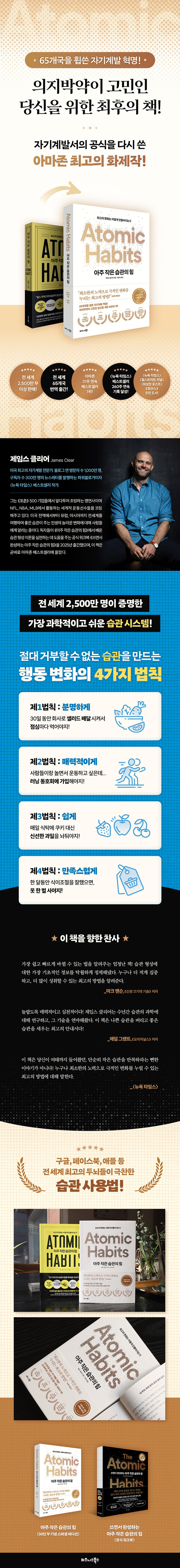2018³â Ãâ°£ Áï½Ã ¾Æ¸¶Á¸ º£½ºÆ®¼¿·¯ 1À§¸¦ ±â·ÏÇϸç Àü ¼¼°è 2,500¸¸ ¸íÀÇ »îÀ» ¹Ù²Û ½À°üÀÇ ¹ÙÀÌºí ¡¶¾ÆÁÖ ÀÛÀº ½À°üÀÇ Èû¡·ÀÌ ±¹³» 50¸¸ ºÎ µ¹ÆÄ¸¦ ±â³äÇØ ½ºÆä¼È ¿¡µð¼ÇÀ¸·Î µ¹¾Æ¿Ô´Ù. Ãâ°£ 7³âÀÌ Áö³ Áö±Ýµµ ÀÌ Ã¥ÀÌ Àü ¼¼°è µ¶Àڵ鿡°Ô ¶ß°Å¿î »ç¶ûÀ» ¹Þ´Â ÀÌÀ¯´Â, ¼º°øÀÌ °ÅâÇÑ °á½É¿¡¼°¡ ¾Æ´Ï¶ó ¾ÆÁÖ ÀÛ°Ô ¹Ýº¹µÇ´Â Çൿ¿¡¼ ½ÃÀ۵ȴٴ »ç½ÇÀ» °úÇÐÀûÀÌ°í ±¸Ã¼ÀûÀÎ ½Ã½ºÅÛÀ¸·Î Á¦½ÃÇϱ⠶§¹®ÀÌ´Ù. À̹ø ½ºÆä¼È ¿¡µð¼ÇÀº ¡®ÀÛÀº ½À°ü¡¯À» ¡®¿øÀÚ¡¯(Atomic)·Î ½Ã°¢ÈÇÑ ÇØ¿Ü ¿ø¼¿Í µ¿ÀÏÇÑ À̹ÌÁö¸¦ »ç¿ëÇÏ¿© Ã¥ÀÌ ÀüÇÏ´Â º»ÁúÀûÀÎ ¸Þ½ÃÁö¸¦ ÇÑÃþ ´õ °Á¶ÇÑ´Ù.
