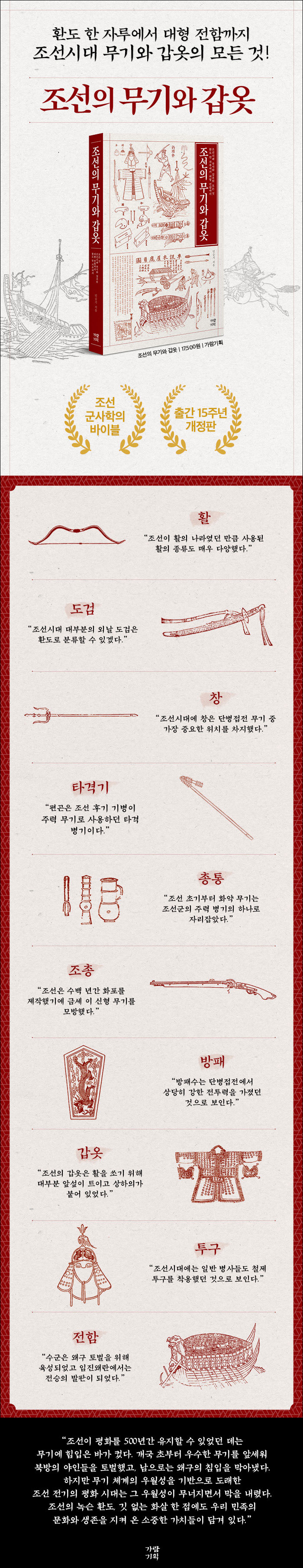Á¶¼±½Ã´ë¿¡ »ç¿ëµÈ ¹«±âÀÇ ¿ª»ç¿Í ¿ëµµ, Ư¡, ±×¸®°í ±º»ç ü°è µîÀ» Æø³Ð°Ô Á¤¸®ÇÏ¿© ÀüÅë »çȸ¹®È»ç¿Í ±º»çÇп¡ °ü½ÉÀ» °¡Áø µ¶Àڵ鿡°Ô ²ÙÁØÈ÷ ¼±Åà ¹Þ¾Æ ¿Â ¡ºÁ¶¼±ÀÇ ¹«±â¿Í °©¿Ê¡» °³Á¤ÆÇÀÌ 15³â ¸¸¿¡ ±×°£ÀÇ ¿¬±¸ ¼º°ú¸¦ ¹Ý¿µÇϰí ÀÛÀº ¿À·ùµéÀ» ¼öÁ¤ÇÏ¿© Ãâ°£µÇ¾ú´Ù. ÀúÀÚ´Â ÀÌ Ã¥ÀÇ ÁýÇÊÀ» À§ÇØ Á¶¼±¿ÕÁ¶½Ç·ÏÀ» ºñ·ÔÇÏ¿© °¢Á¾ º´¹ý¼¿Í ¹«¿¹¼, ±×¸®°í °¢ Áö¹æ À¾Áö¿Í °³ÀÎ ¹®Áý µîÀ» »ìÆìº¸´Â °ÍÀº ¹°·Ð, ¿©·¯ ¹Ú¹°°ü¿¡ ¼ÒÀåµÈ ¹«±â À¯¹° ¹× Á¶¼± ¿Õ¸ªÀÇ ¹«Àμ®¿¡ »õ°ÜÁø °©ÁÖ, ÇöÀç±îÁö Àü½ÂµÇ°í ÀÖ´Â ÀüÅë µµ°Ë ¹× ±Ã½Ã Á¦ÀÛ ±â¹ý µîÀ» Á÷Á¢ Á¶»çÇÏ¿© Á¶¼±½Ã´ë ¹«±â¿Í °©¿Ê¿¡ ´ëÇØ ü°èÀûÀÎ Á¤¸®¸¦ ½ÃµµÇϰí ÀÖ´Ù.