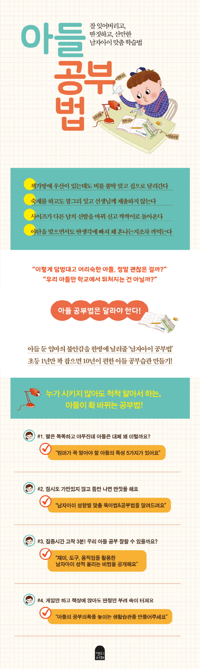 Áö±Ý±îÁö ¼ö¸¹Àº ³²ÀÚ¾ÆÀ̵éÀ» °¡¸£Ä¡¸é¼, ¾ÆµéÀÇ Æ¯¼ºÀ» °í·ÁÇÑ ÇнÀ¹ýÀº µû·Î ÀÖÀ½À» ±ú´Þ¾Ò°í, ¡¶¾Æµé °øºÎ¹ý¡·¿¡ ±× ³ëÇϿ츦 ¸ðµÎ ´ã¾Ò´Ù. Àú¼·Î ¡¶³î¸é¼ °øºÎÇÏ´Â ¾ÆÀÌ Å°¿ì±â¡·, ¡¶ÃʵîÇб³ ÀÔÇÐ ÈÄ, 3³â°£ ºÎ¸ð°¡ ÇØ¾ß ÇÒ À°¾Æ¡· µîÀÌ ÀÖ´Ù.