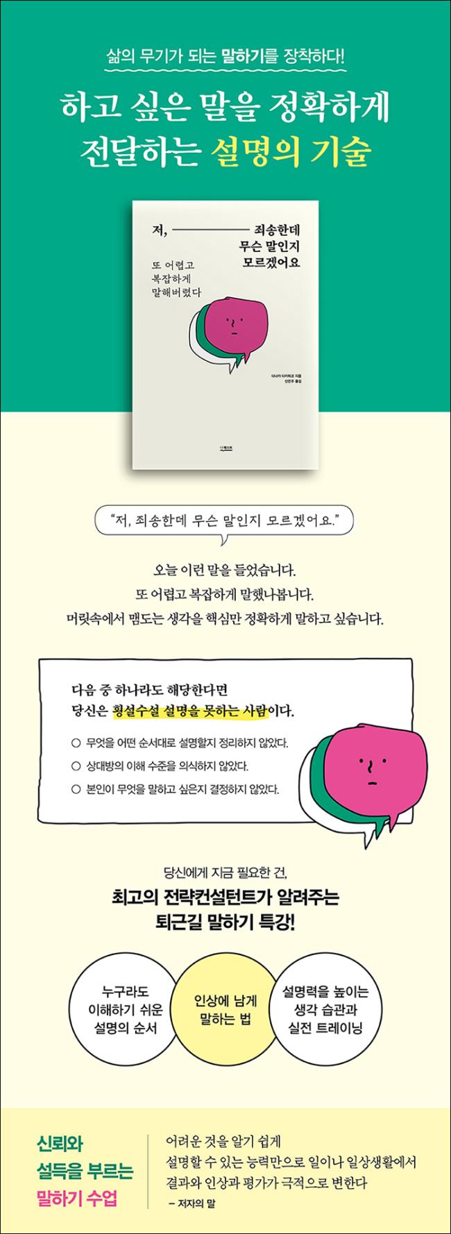 ¡¶Àú, Á˼ÛÇѵ¥ ¹«½¼ ¸»ÀÎÁö ¸ð¸£°Ú¾î¿ä¡·´Â ÇÏ°í ½ÍÀº ¸»À» Á¤È®ÇÏ°Ô Àü´ÞÇÏ´Â ¼³¸íÀÇ ±â¼úÀ» ¾Ë·ÁÁØ´Ù. ÄÁ¼³ÆÃºñ·Î ¼ö¾ï ¿øÀ» ³»°í ÀÛÀº °Íµµ ±×³É ³Ñ¾î°¡Áö ¾Ê´Â ±ñ±ñÇÑ °í°´µé°ú ¿À·£ ±â°£ ÀÏÇÑ º£Å×¶û Àü·«ÄÁ¼³ÅÏÆ®°¡ ÀÚ½ÅÀÇ ¸»Çϱ⠳ëÇϿ츦 ÀÌ Ã¥¿¡ ¸ðµÎ ´ã¾Ò´Ù.