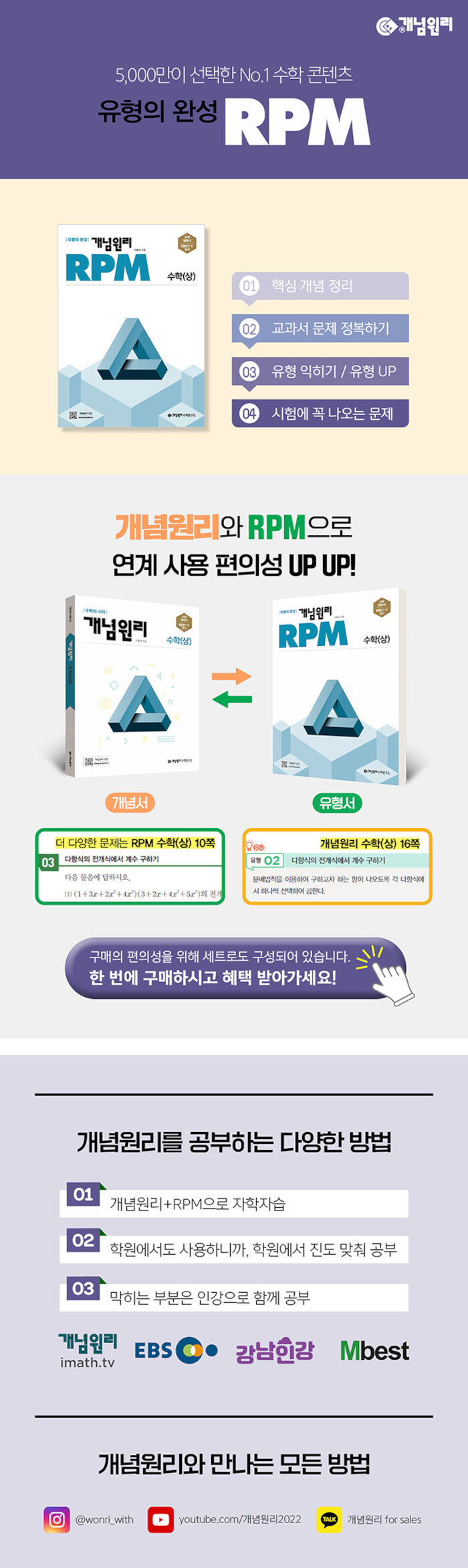 3. °³³ä¿ø¸® ¼öÇÐÀÇ Çʼö ¿¹Á¦¸¦ À¯ÇüÈÇÏ¿´½À´Ï´Ù. °³³ä¿ø¸® ¼öÇб⺻¼ÀÇ Çʼö ¿¹Á¦¸¦ À¯ÇüÈÇÏ°í °¢ À¯Çü¿¡ µû¸¥ ´Ù¾çÇÑ ¹®Á¦¸¦ ½Ç¾î À̸¦ ÅëÇØ ÀÀ¿ë·Â°ú ¹®Á¦Çذá·ÂÀ» ±â¸¦ ¼ö ÀÖµµ·Ï ÇÏ¿´½À´Ï´Ù. µû¶ó¼ °³³ä¿ø¸® ¼öÇб⺻¼¿Í ¿¬°èÇÏ¿© °øºÎÇÏ´Ù º¸¸é ÇнÀ È¿°ú°¡ ´õ¿í ³ô¾ÆÁú °ÍÀÔ´Ï´Ù.