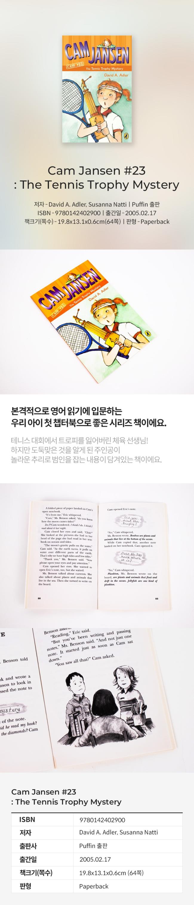 Elementary school sleuth Cam Jansen finds herself immersed in yet another mystery when the gym teacher's tennis trophy vanishes and Cam, along with her friend Eric, must follow the clues to find it. Reprint.