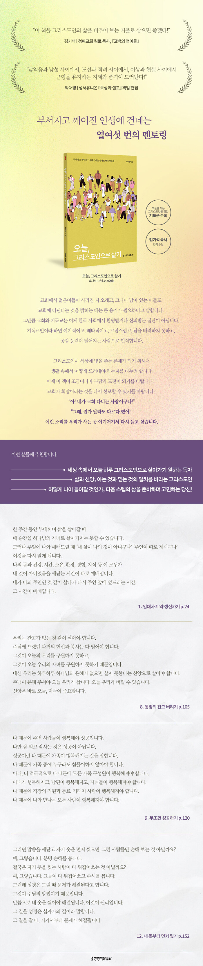 º¹Àâ´Ù´ÜÇÑ »îÀÇ °¥ÇÇ¿Í ±¼°î »çÀÌ¿¡¼ ±×¸®½ºµµÀÎÀ¸·Î »ì¾Æ°¥ ±Ù·ÂÀ» Ű¿ö Áִ åÀÌ´Ù. ³ôÀº¶æÁ¤ÀDZ³È¸¿¡¼ »ç¿ª ÈÄ ºÐ¸³ °³Ã´ÇÏ¿©, ÇöÀç´Â ³ôÀº¶æ´ö¼Ò±³È¸¿¡¼ ¸ñ¾çÇÏ¸ç ±×¸®½ºµµÀÎÀ¸·Î »ì¾Æ°¡´Â ¿À´ë½Ä ¸ñ»çÀÇ ½Å°£ÀÌ´Ù. ¼³ÇÍ º¸¾Æ¼´Â °í°³¸¦ °¼¿ôÇÏ°Ô ÇÏ´Â Á¦¸ñµéÀÌ ´«¿¡ µé¾î¿Â´Ù. ºÐ¸í ½Å¾Óµµ¼Àε¥ ¡®ÀÓ´ëÂ÷ °è¾à °»½ÅÇϱ⡯, ¡®¹«Á¶°Ç ¼º°øÇϱ⡯, ¡®ÃÖ°í ºê·£µå·Î ¿Ê ÀԱ⡯¶ó´Ï ¾î¾ÈÀÌ º¡º¡ÇÏ´Ù.