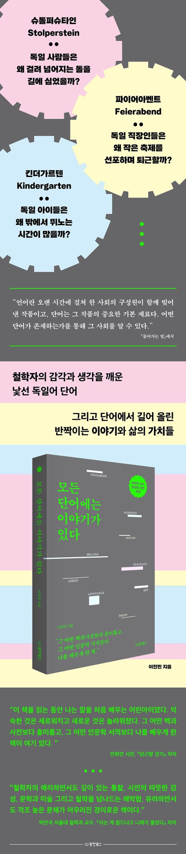 ¡º¾ÆÀ̶ó´Â ½£¡» ¡º´ÙÁ¤ÇÑ Ã¶ÇÐÀÚÀÇ ¹Ì¼ú°ü ÀÌ¿ë¹ý¡» ¡º³ª´Â öÇÐÇÏ´Â ¾ö¸¶ÀÔ´Ï´Ù¡» µîÀÇ Ã¥À» ÅëÇØ Àڳ౳À°, ¿¹¼ú, Àι® ºÐ¾ß¸¦ ³Ñ³ªµé¸ç öÇÐÀ» ¡®ÀÏ»óÀÇ ¸»¶û¸»¶ûÇÑ ¾ð¾î¡¯·Î ÀüÇØ¿Â ÀÌÁø¹Î ÀÛ°¡°¡ µ¹¾Æ¿Ô´Ù. ½Å°£ ¡º¸ðµç ´Ü¾î¿¡´Â À̾߱Ⱑ ÀÖ´Ù¡»´Â µ¶ÀÏÀ̶ó´Â ³¸¼± ¶¥¿¡¼ »ì°Ô µÈ ÀúÀÚ°¡ ¼±º°ÇÑ µ¶ÀÏ¾î ´Ü¾î¿Í À̸¦ µÑ·¯½Ñ À̾߱⸦ ´ãÀº Ã¥ÀÌ´Ù. ¾Æ¸£¹ÙÀÌÆ®(Arbeit)ó·³ ¿ì¸®¿¡°Ô Àͼ÷ÇÑ ´Ü¾îºÎÅÍ ¡®ÀÜÀÎÇÏ°í ¹«ÀÚºñÇÑ, Â÷°©±â ±×Áö¾ø´Â °Å´ëÇÑ ¼¼»ó ¼Ó¿¡¼ ÀÚ½ÅÀÇ ¹«·ÂÇÔÀ» ´À³¥ ¶§ ¹Ð·Áµå´Â °íÅë°ú ½½ÇÄ¡¯À» ¶æÇÏ´Â º§Æ®½´¸Þ¸£Ã÷(Weltschmerz) °°Àº »ý¼ÒÇÑ ´Ü¾î±îÁö ¼Ò°³µÈ ´Ü¾îÀÇ ¸é¸éÀÌ ´Ùä·Ó´Ù. ÀÌ Ã¥Àº µ¶ÀÚ¿¡°Ô »õ·Î¿î ´Ü¾î¿Í ¸¸³ª´Â ÁöÀû Áñ°Å¿òÀ» ¼±»çÇÏ´Â µ¥ ±×Ä¡Áö ¾Ê´Â´Ù. »çȸ ±¸¼º¿øÀÌ °øÀ¯ÇÏ´Â ´Ü¾î¸¦ ÅëÇØ µ¶ÀÏ »çȸÀÇ °¡Ä¡¿Í ÁöÇâÀ» Àо´Â µ¿½Ã¿¡ ¿ì¸® »çȸÀÇ °¡Ä¡¿Í ÁöÇâÀº ¹«¾ùÀ̾î¾ß ÇÏ´ÂÁö µ¹¾Æº¸°Ô ÇÑ´Ù.