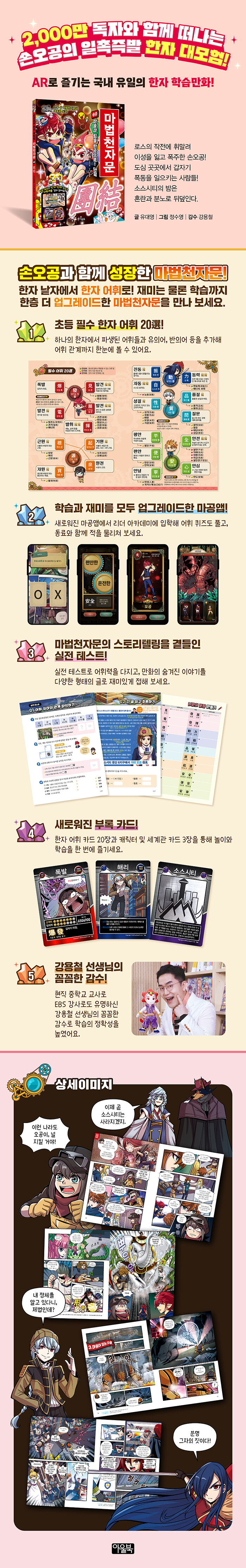 2,000¸¸ µ¶ÀÚ°¡ ¼±ÅÃÇÑ ¸¶¹ýõÀÚ¹®Àº 2003³â ù Ãâ°£µÈ ÀÌÈÄ, Áö³ 20³â°£ ÇÑÀÚ ÇнÀÀÇ ¿Ç³À» ÀÏÀ¸Å°¸ç ¾î¸°À̵鿡°Ô Å« »ç¶ûÀ» ¹Þ¾Æ¿Ô´Ù. ¡º¸¶¹ýõÀÚ¹®¡» 1~53±ÇÀº °¢ ±Ç º°·Î µîÀåÇÏ´Â ½Å±Ô ÇÑÀÚ 20ÀÚ¸¦ ¸¸È ¼Ó À̾߱⿡ ³ª¿À´Â ÇÑÀÚ ¸¶¹ýÀ» ÅëÇØ Àç¹ÌÀÖ°Ô ÀÍÈú ¼ö ÀÖµµ·Ï ±¸¼ºÇß´Ù. ±Ç¼ö¸¦ ´õÇØ°¥¼ö·Ï ÀúÀý·Î ¾Ï±âµÇ´Â ÇÑÀÚÀÇ ¾çÀº ´Ã¾î³ª°í, ÇÑÀÚ ³¹ÀÚ µÎ °³¸¦ ºÙ¿© ¸¸µå´Â ´Ü¾î¸¶¹ý°ú ÇÑ °³ÀÇ ³¹ÀÚ¸¦ ´Ù¾çÇÑ ³¹ÀÚµé°ú ÇÕÃÄ È®ÀåÇÏ´Â ´Ü¾îÈ®À帶¹ý±îÁö ÀÐ°í ³ª¸é ÇÑÀÚ ´É·ÂÀÌ ºÎ½ Çâ»óµÈ´Ù.