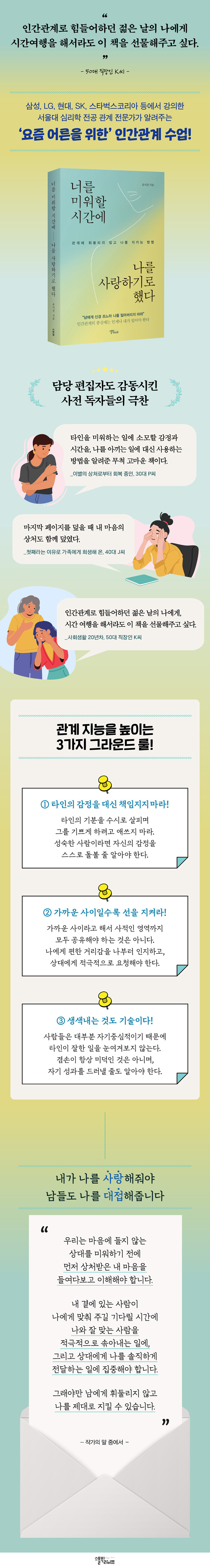 ¿ì¸®´Â Àΰ£°ü°è°¡ »ý°¢Ã³·³ Èê·¯°¡Áö ¾ÊÀ» ¶§, ŸÀÎÀ» ¿ø¸ÁÇÏ´Â ÀÏ¿¡ ½Ã°£°ú ¿¡³ÊÁö¸¦ ¸¹ÀÌ ½ñ´Â´Ù. ¡®¿Ö ±× »ç¶÷Àº ³ª¿¡°Ô ±×·± ¸»À» ÇßÀ»±î?¡¯, ¡®¿Ö ±× »ç¶÷Àº ³» ¸¶À½À» ¸ô¶óÁÙ±î?¡¯¶ó´Â Áú¹®À» ´øÁö¸ç ³ª¸¦ ¹è·ÁÇÏÁö ¾Ê´Â ŸÀÎÀ» ¹Ì¿öÇÏ´Â ÀÏ¿¡ ½Ã°£°ú °¨Á¤À» ¼Ò¸ðÇÑ´Ù. ÇÏÁö¸¸ ÀúÀÚ´Â ±×·± ¿ì¸®¿¡°Ô ´ÜÈ£ÇÏ°Ô ¸»ÇÑ´Ù. ŸÀÎÀ» ¹Ì¿öÇÏ´Â ÀÏ¿¡ ¿¡³ÊÁö¸¦ ³¶ºñÇϱ⿣ ´ç½ÅÀÇ ÀλýÀÌ ³Ê¹«³ªµµ ¼ÒÁßÇÏ´Ù°í. ´ç½ÅÀÇ ±ÍÇÑ »îÀº ŸÀÎÀ» ÇâÇÑ ¹Ì¿òÀÌ ¾Æ´Ñ ¡®ÀÚ½ÅÀ» ÇâÇÑ »ç¶û¡¯À¸·Î ä¿ö¾ß ÇÑ´Ù°í.