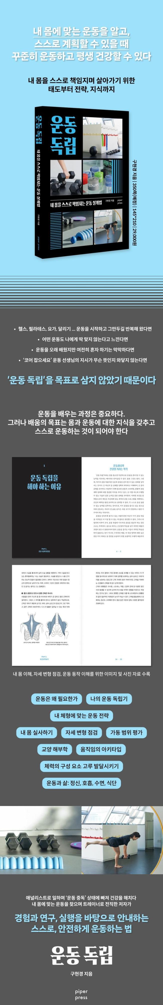 ¡º¿îµ¿ µ¶¸³¡»Àº ºÎÀ§º°, Á¾¸ñº° ¿îµ¿¹ýÀ̳ª ±ÙÀ° µî ƯÁ¤ ÀÎü ±¸¼º ¿ä¼Ò¸¦ ´Ù·ç´Â ÇØºÎÇÐÀ» ³Ñ¾î ¸ö°ú ¿îµ¿ÀÇ °ü°è¸¦ ÃÑÇÕÀûÀ¸·Î ´Ù·é µå¹® Ã¥ÀÌ´Ù. ¿îµ¿À» Çϱâ·Î ¸¶À½¸Ô´Â °ÍºÎÅÍ, ½ÇÇàÇϰí, ½À°üÀ¸·Î ¸¸µå´Â Àü °úÁ¤À» ¾È³»ÇÑ´Ù. Ã¥À» ÀÐ°í ³ª¸é, ³» ¸öÀ» ½º½º·Î Ã¥ÀÓÁö¸ç »ì¾Æ°¥ ¼ö ÀÖ´Â Àڽۨ°ú Àü·«À» ¾ò°Ô µÈ´Ù.